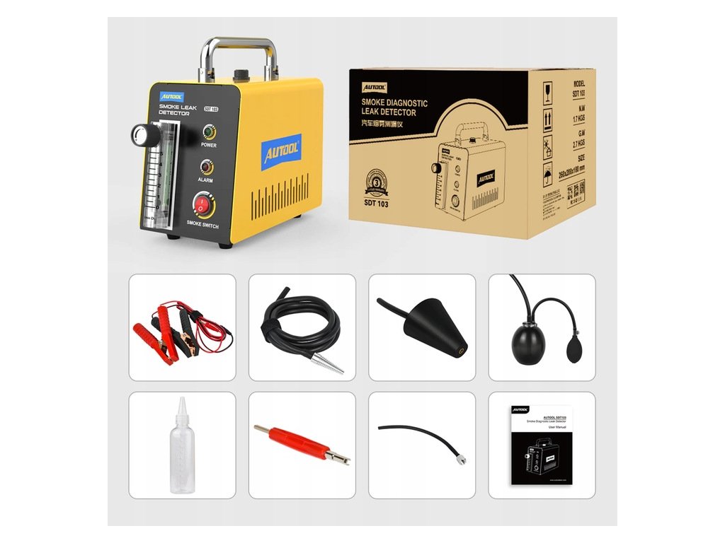 Autool SDT103 je profesionálny automatický generátor dymu na presnú diagnostiku netesností v potrubiach, hadiciach, spojkách a uzavretých systémoch vozidla. Umožňuje rýchle a jednoznačné odhalenie únikov v sacom, výfukovom, chladiacom, palivovom aj EVAP systéme.