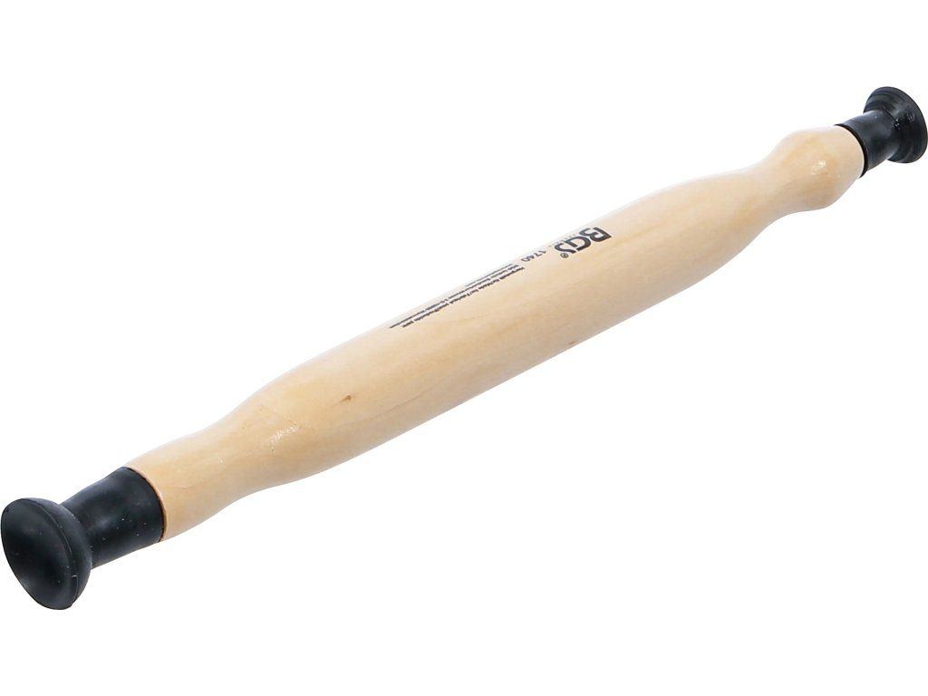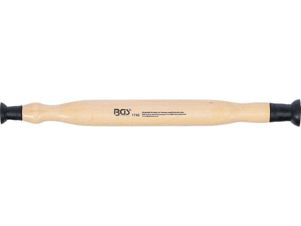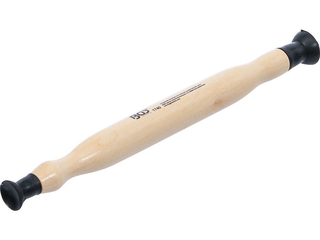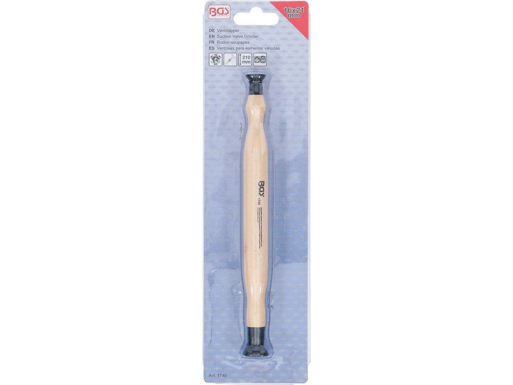 Prípravok je vybavený drevenou rukoväťou, ktorá sa pohodlne drží a umožňuje citlivé ovládanie počas práce. Na oboch koncoch sa nachádzajú gumové prísavky s priemerom 16 mm a 21 mm, takže je vhodný na prácu s menšími ventilmi a jemnejšiu manipuláciu.