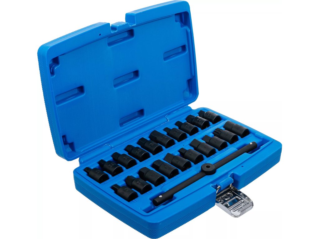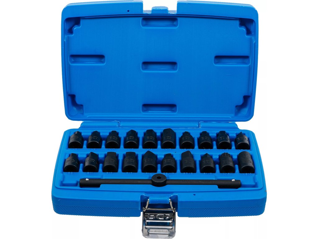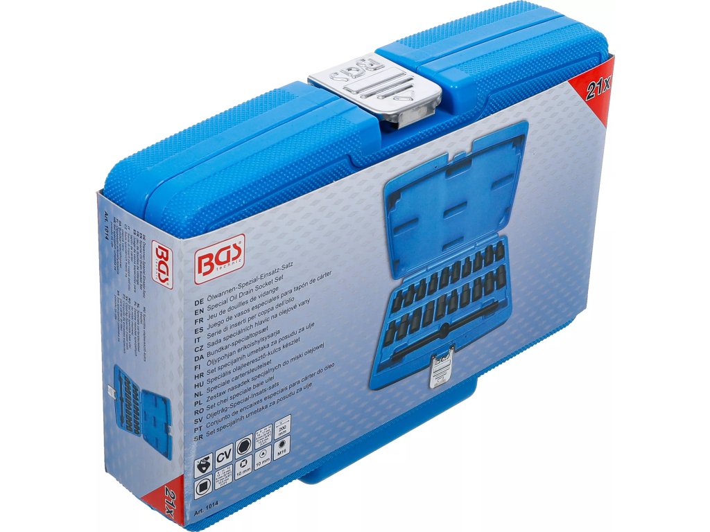 21-dielna sada špeciálnych nástavcov BGS 1014 pre demontáž a montáž vypúšťacích skrutiek olejových vaní. Kompatibilná s väčšinou bežných automobilov a úžitkových vozidiel.