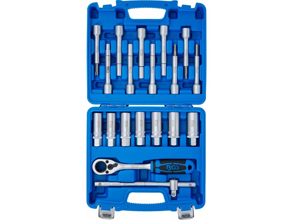 - 7 x hlbokých šesťhranných objímok, vnútorný štvorhran 12,5 mm (1/2") a vonkajší šesťhran 21 mm, veľkosti 16 - 17 - 18 - 19 - 21 - 22 - 24 mm