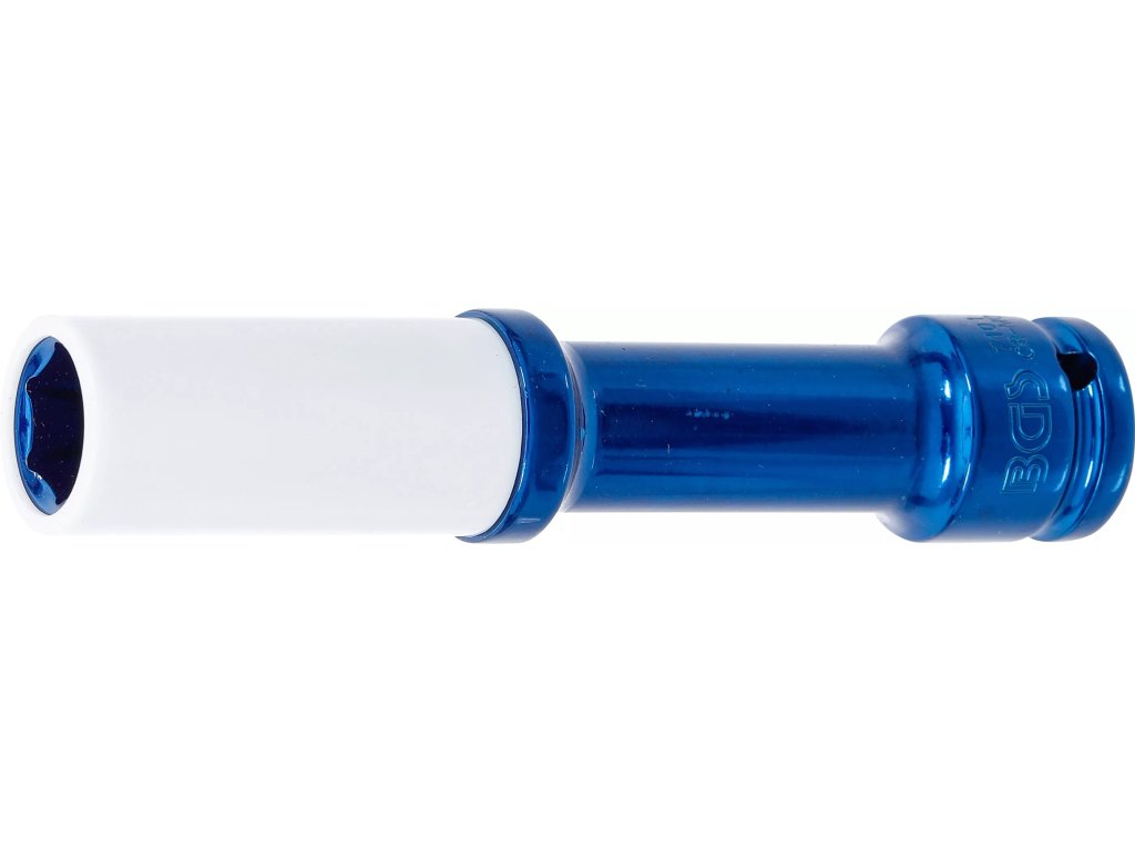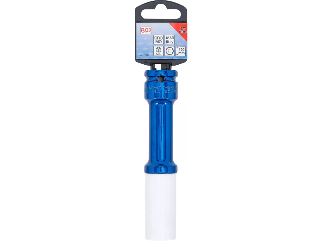 Profesionálna 17 mm rázová hlavica s ochranným plastovým plášťom na kolesové skrutky hliníkových diskov. Extra dlhá 150 mm, pohon 1/2" (12,5 mm), materiál Cr-Mo.