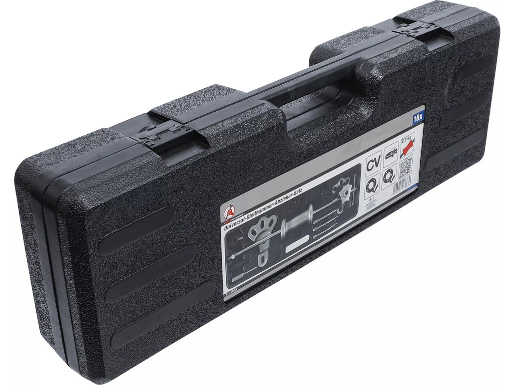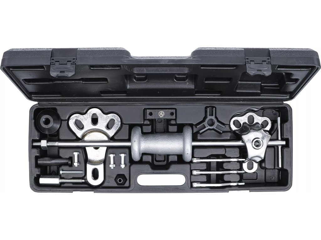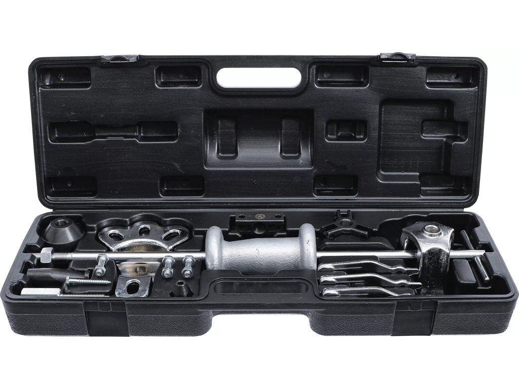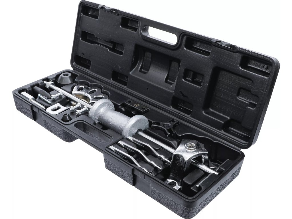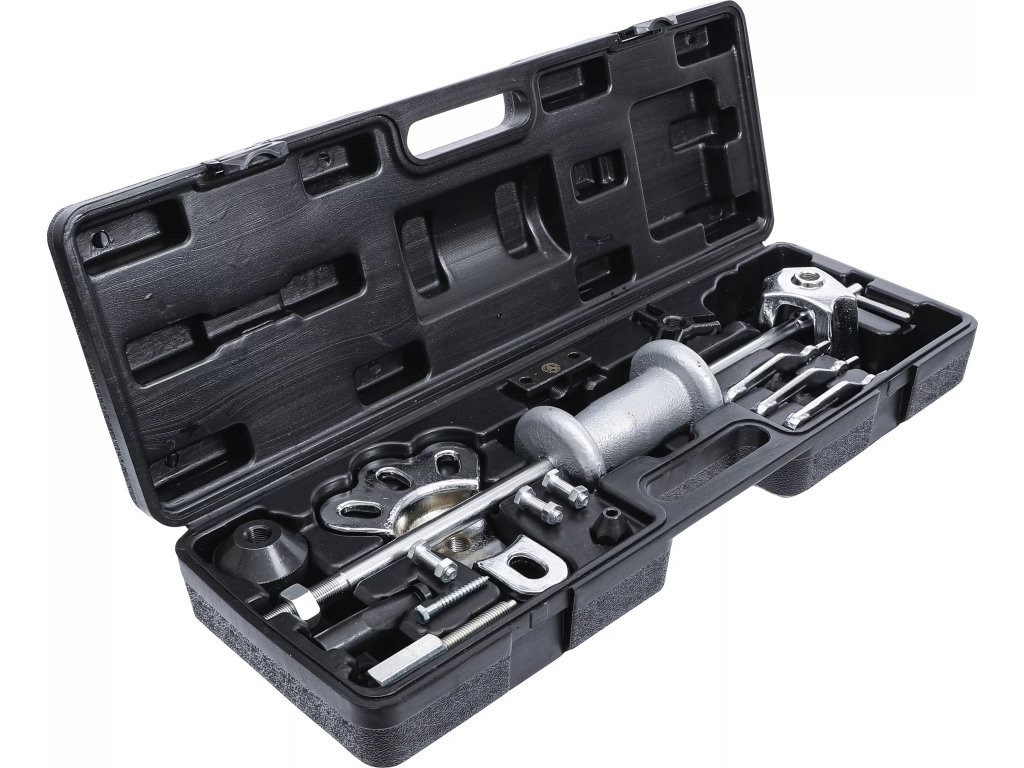Univerzálna sada BGS 7683 je praktický pomocník pre autoservisy a dielne. Obsahuje spätné kladivo s rôznymi adaptérmi nadstavcami, ktoré umožňujú pokračovať a efektívnu prácu pri odstránení ložísk, hriadeľov, nábojov kolies, ozubených kolies a ďalších pevne osadených častí. Robustné prevedenie z kvalitnej ocele vyžaduje životnosť a spoľahlivosť aj pri intenzívnom používaní.