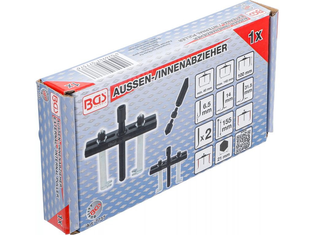 Univerzálny 2-ramenný sťahovák BGS 7737 s rozsahom 40–145 mm (vnútorný) a 70–170 mm (vonkajší). Ideálny na ložiská, ozubené kolesá a púzdra.