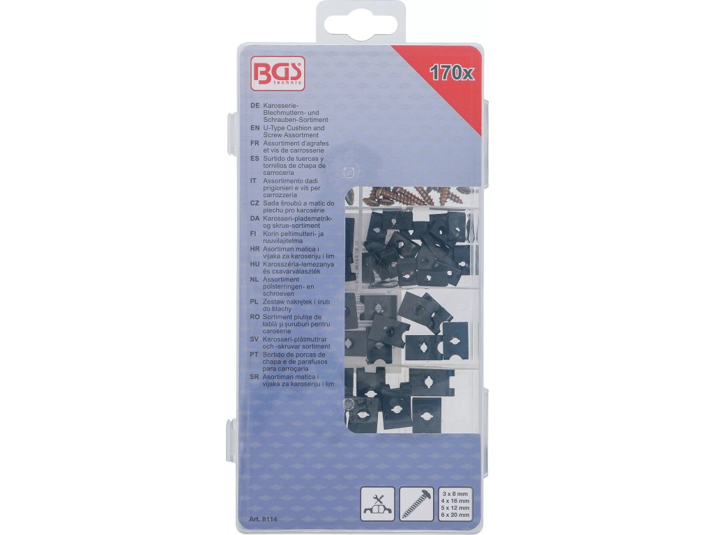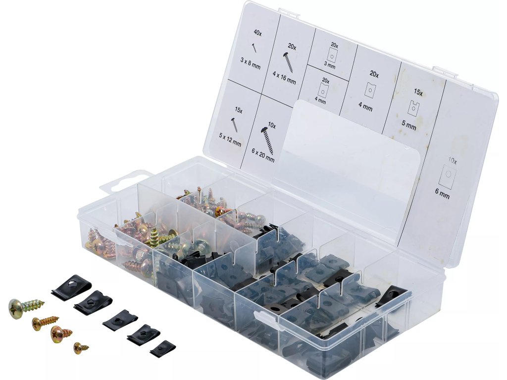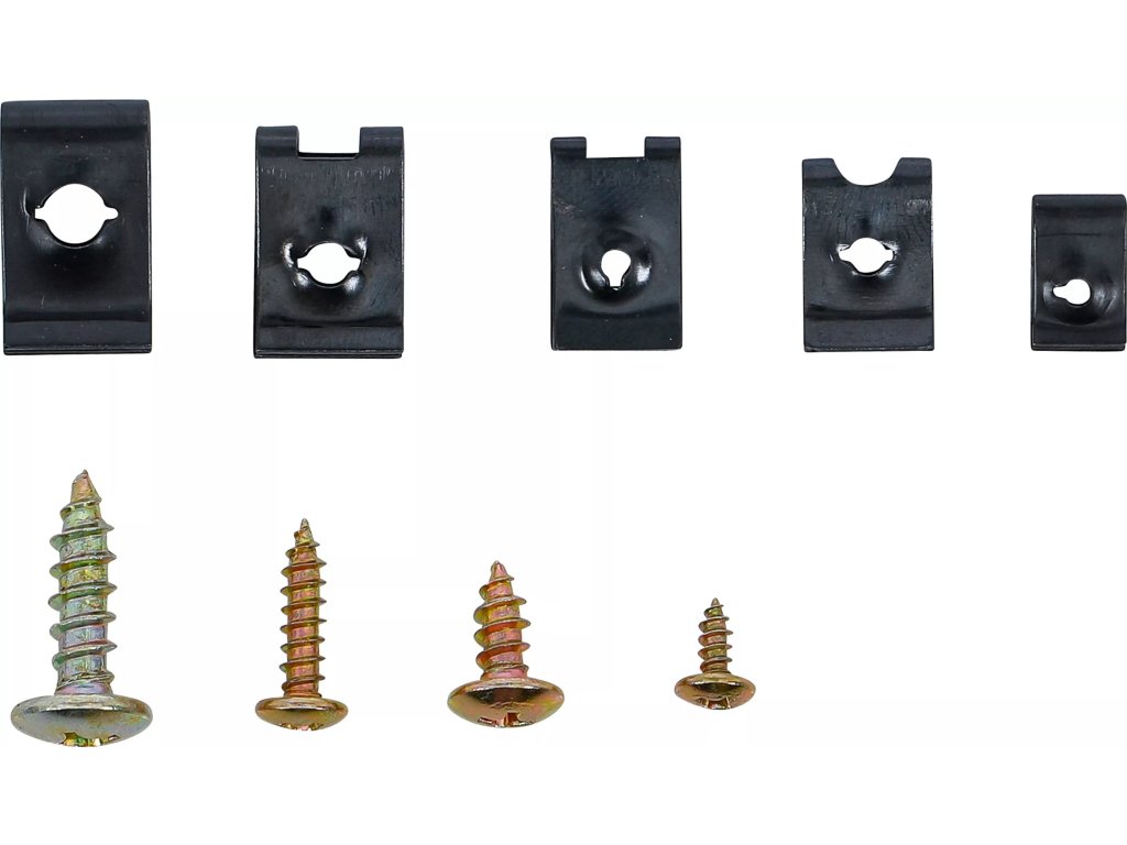 Univerzálna sada 170 kusov skrutiek a U-klipov rôznych veľkostí, ideálna pre karosárske práce, montáž plastových dielov a upevňovanie blatníkov. Dodávaná v praktickom plastovom boxe.