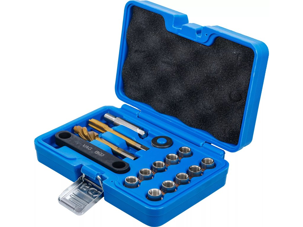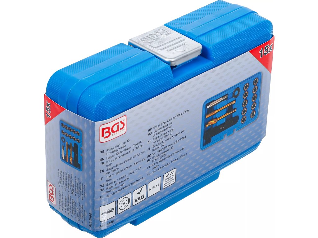 Sada BGS 8408 je určená na rýchlu a presnú opravu poškodených závitov brzdových strmeňov v automobiloch koncernu VAG. Umožňuje efektívne obnovenie závitu M12 × 1,5 mm bez nutnosti výmeny celého dielu. Vysoká presnosť spracovania a kvalitné materiály zabezpečujú spoľahlivé a trvácne opravy.