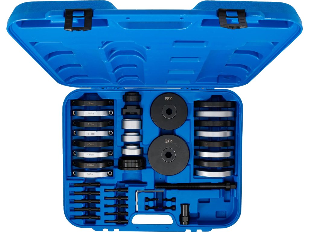 BGS sada na ložiská kolies VAG je určená na odbornú demontáž a montáž nábojových jednotiek ložísk kolies bez zbytočného poškodenia okolitých dielov. Je vhodná pre servisné práce na vybraných vozidlách koncernu VAG, kde je potrebné presné a silové lisovanie ložiskových a nábojových jednotiek.