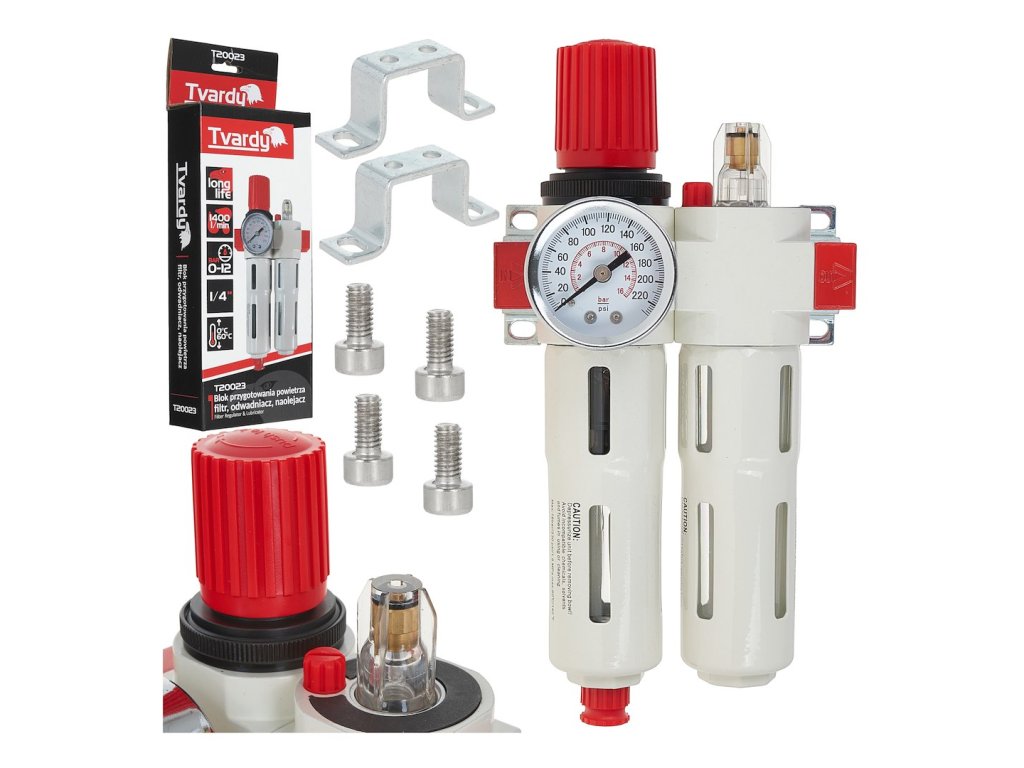 Blok prípravy vzduchu Tvardy 1/4" spája regulátor tlaku, filter, odvodňovač a maznicu v jednom kompaktnom tele. Zabezpečí čistý, suchý a správne premazaný stlačený vzduch pre pneumatické náradie