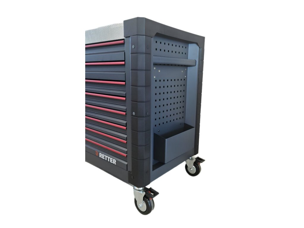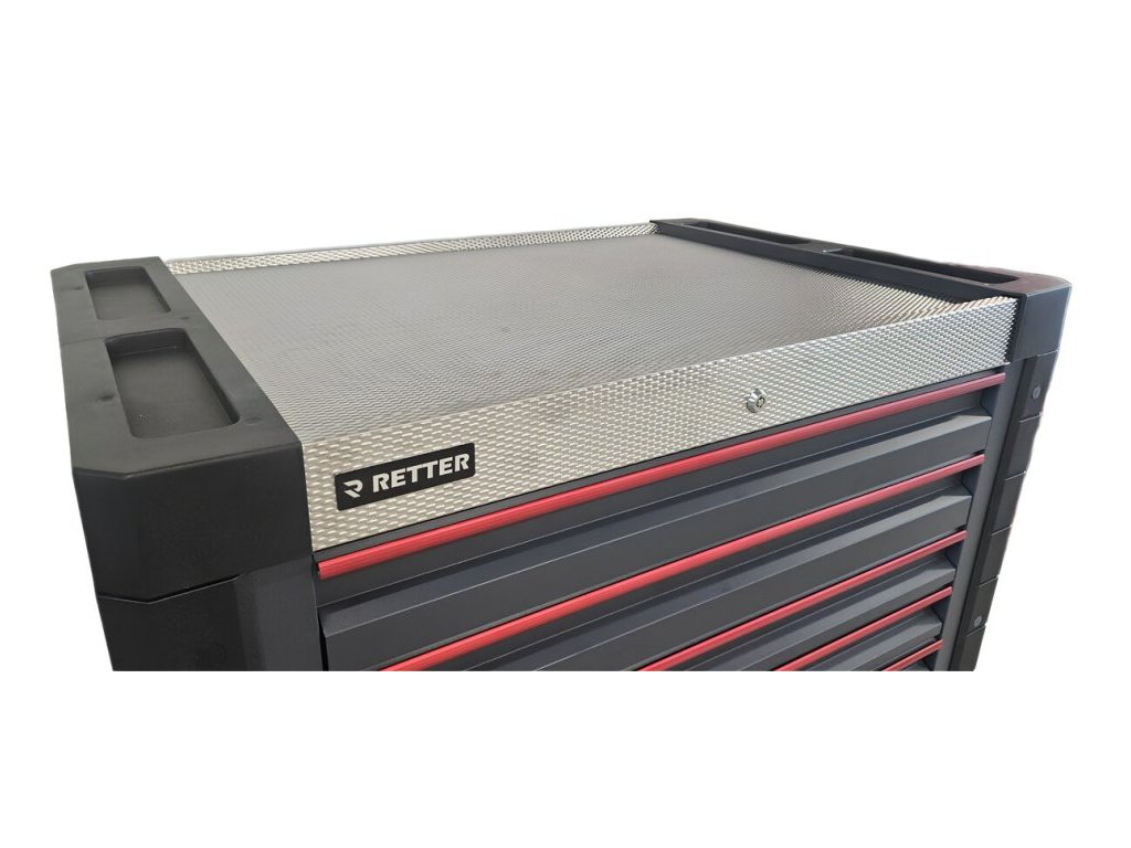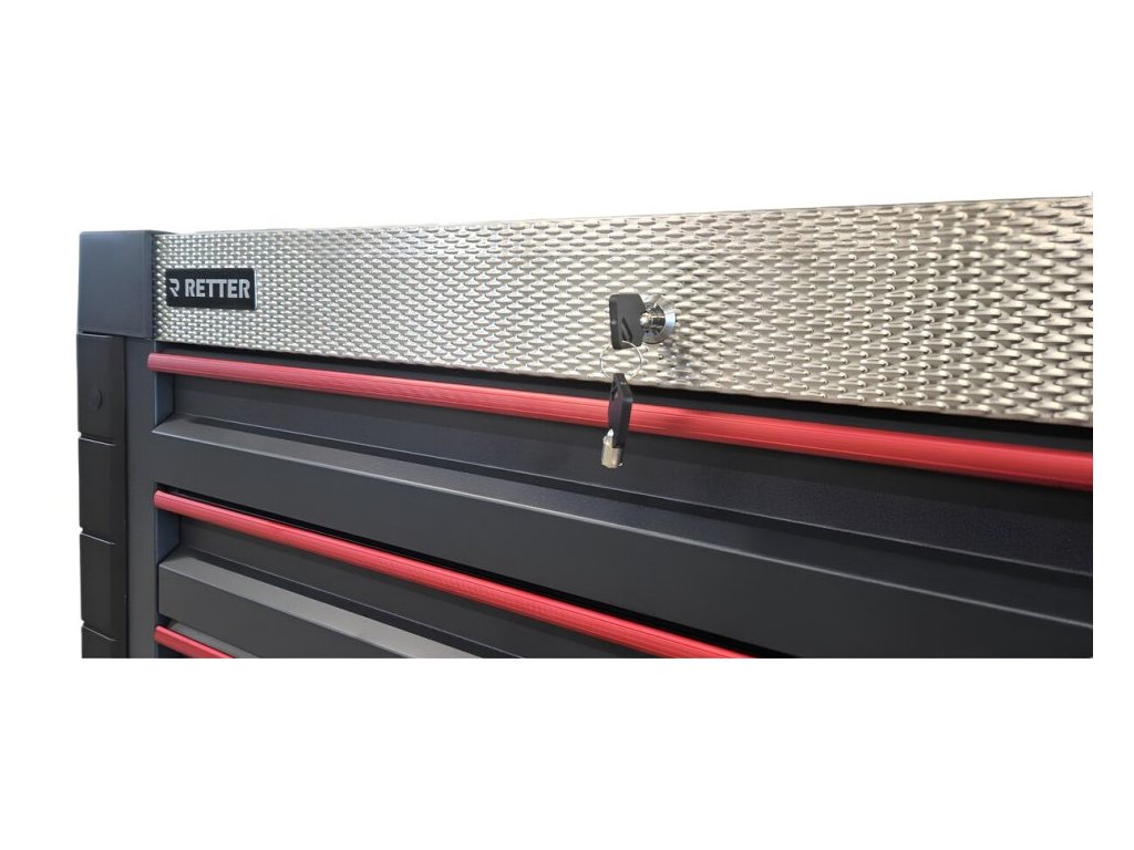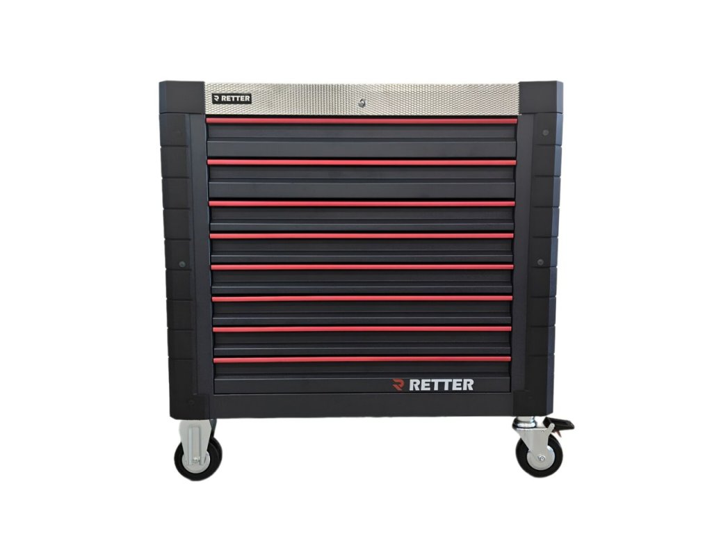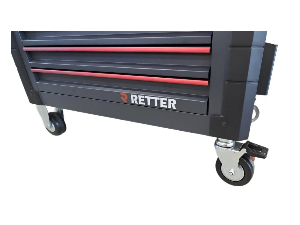 RETTER R12 je kompletne vybavený dielenský vozík so 8 zásuvkami, ktoré sú naplnené kvalitným ručným náradím (698 dielov). Pevný dielenský vozík s náradím so stabilnou pracovnou doskou, ktorá sa ľahko čistí. Je vybavený centrálny zámkom pre všetky zásuvky- Povrch vozíka je ošetrený práškovým nástrekom, ktorý poskytuje ochranu proti korózii. Sada náradia je vyrobená z vysoko kvalitnej chróm-vanádiovej ocele. Zásuvky sú ľahko vytiahnuteľné vďaka posuvným kolajničkám s guličkovými ložiskami. Náradie je uložené v penových vložkách. Celý vozík sa jednoducho premiestňuje vďaka veľkým kolieskam.