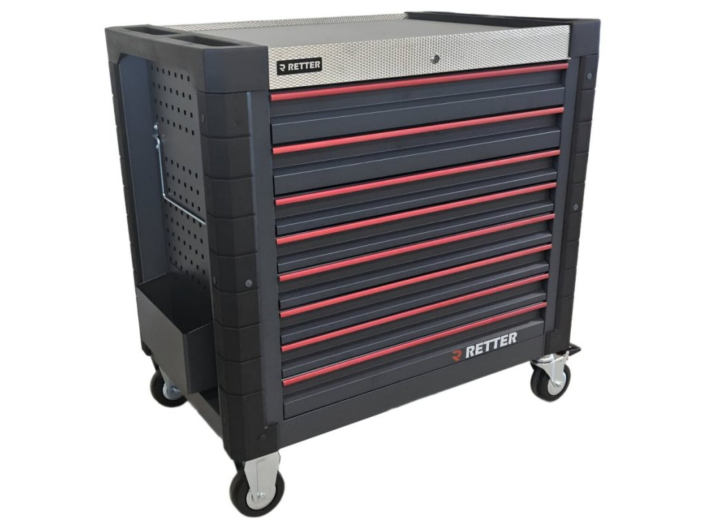Profesionálny dielenský vozík so 7 zásuvkami a 698-dielnou sadou náradia RETTER. Ideálny do autoservisov, dielní a garáží.