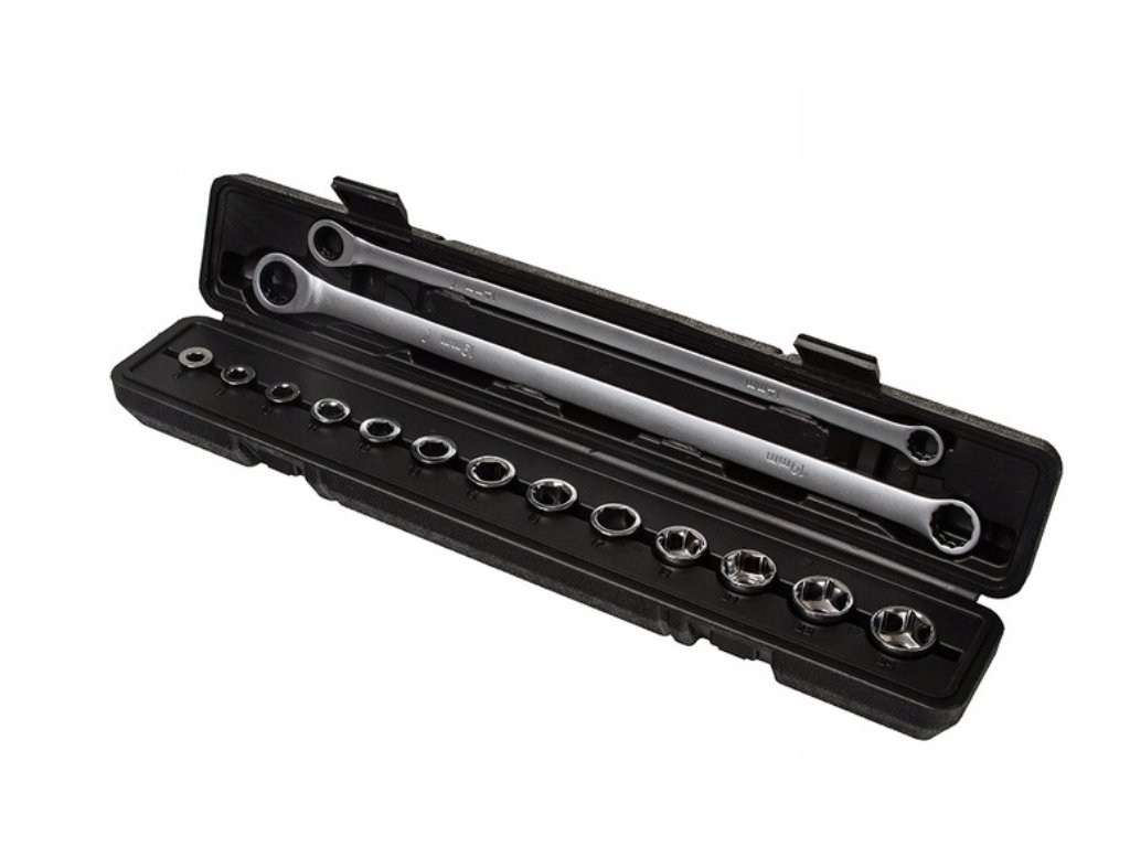 Odolná sada dlhých zalomených očkových kľúčov s račňou vyrobených z chróm-vanádiovej ocele. Vhodná pre profesionálne autoservisy aj domácich majstrov, dodávaná v praktickom kufríku.