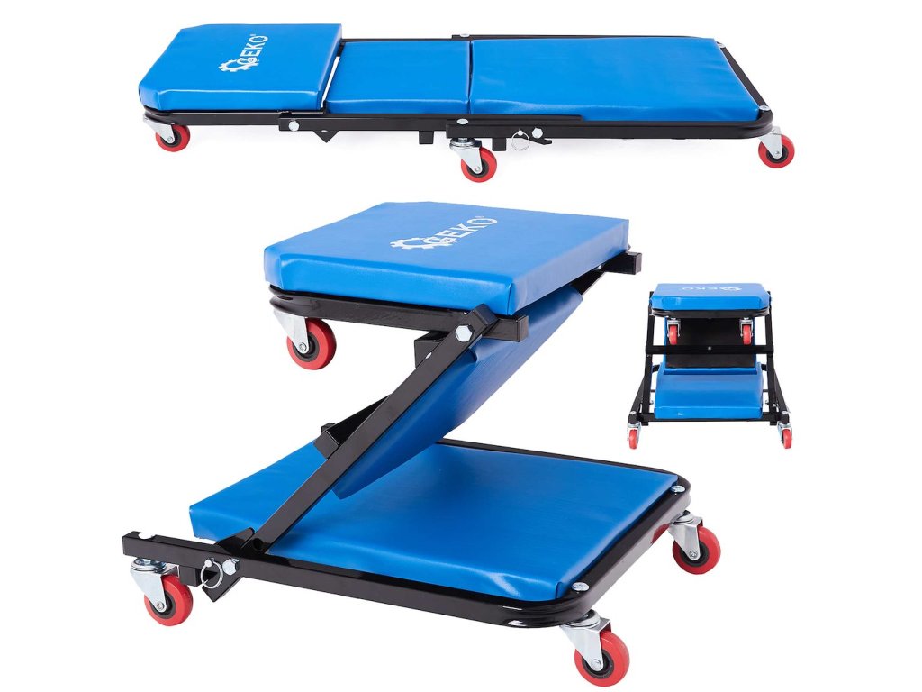 Praktické montážne lehátko GEKO G02106 s funkciou 2v1 umožňuje jednoduché preklopenie na dielenskú stoličku.