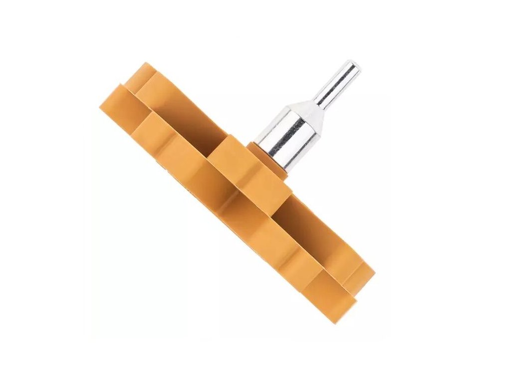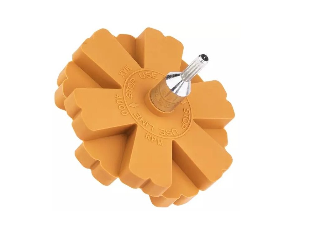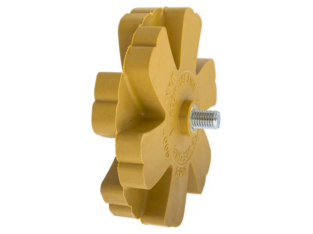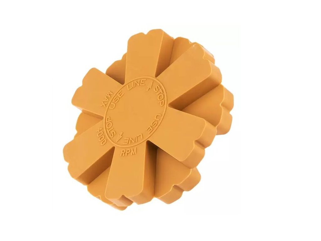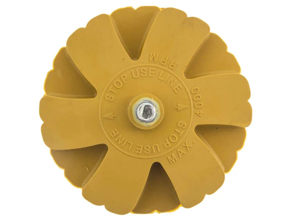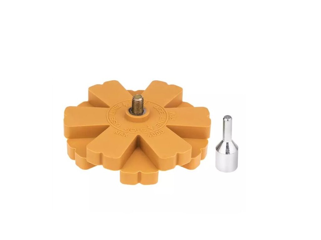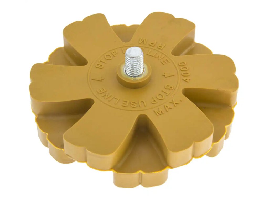 Gumový kotúč je určený na odstraňovanie zvyškov lepiacej pásky a iných nečistôt z ráfikov, ktoré zostali po nalepení závaží. Produkt obsahuje adaptér, ktorý umožňuje rýchle pripevnenie kotúča k nízkorýchlostnému zariadeniu. Kotúč zaisťuje rýchle a bezpečné čistenie a prípravu ráfika na inštaláciu nového závažia. Jeho špeciálny motýlí dizajn zvyšuje prítlačnú silu, vďaka čomu je odstránenie nečistôt rýchlejšie. Dobre zvolená vysoko kvalitná gumová zmes použitá v kotúči nepoškodzuje povrch, nepoškriabe sa a nezanecháva stopy na čistených povrchoch. Použitie kotúča v procese čistenia umožňuje rýchle odstránenie odolných nečistôt. Kotúč je možné použiť s napríklad s pneumatickou vŕtačkou PX87.