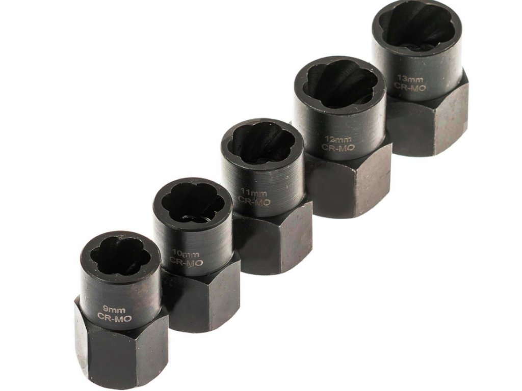Táto sada dlhých hlavíc je určená na bezpečné uvoľnenie spojov, ktoré už bežná hlavica nezvládne – poškodené hrany, „okrúhle“ matice alebo zadreté skrutky. Vnútorný špeciálny závitový profil vytvorí pevný záber tým, že sa pri nasadení zakusne do poškodeného spoja a uzamkne ho, aby ste ho vedeli povoliť štandardným náradím. Dlhé vyhotovenie je praktické pri hlbšie uložených spojoch a tenké steny pomáhajú v ťažko dostupných miestach, napríklad pri skrutkách zliatinových diskov. Na vonkajšej strane má nadstavec štandardné 6-hranné prevedenie, takže je kompatibilný aj s očko-vidlicovými kľúčmi. Hlavice sú z chróm-molybdénovej ocele CR-MO s fosfátovanou povrchovou úpravou pre vyššiu odolnosť – uvoľňovanie však treba robiť citlivo a bez rázových úderov, aby sa spoj zbytočne nepoškodil.