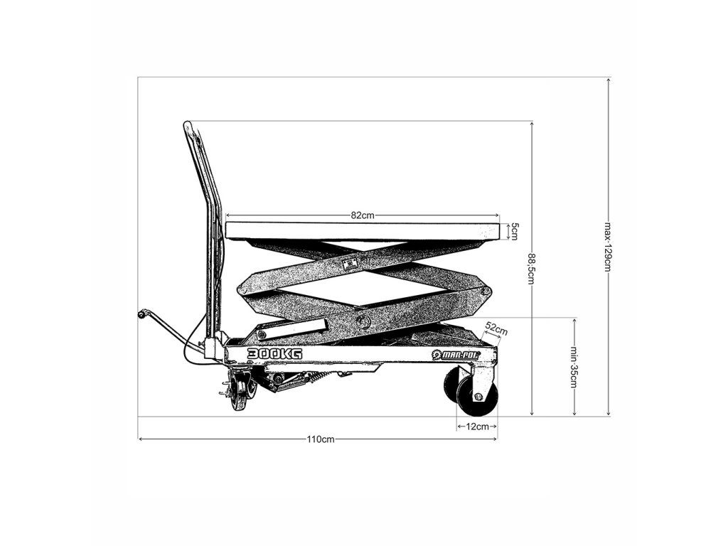 Mobilný nožnicový zdvíhací stôl s nosnosťou 300 kg a pracovnou plochou 82 × 52 cm.