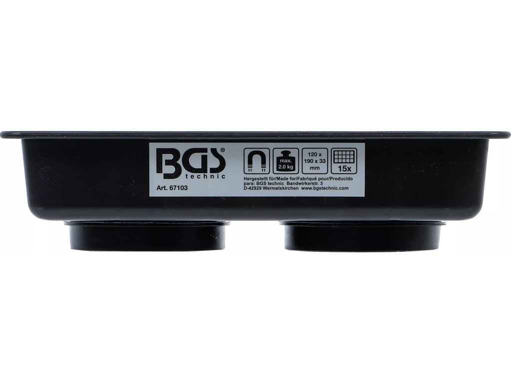 Magnetická miska BGS 67103 umožňuje mať skrutky, matice, podložky a ďalšie malé súčiastky vždy po ruke. Vďaka silnému magnetu ju možno rýchlo a jednoducho pripevniť na kovové povrchy, čím sa minimalizuje riziko straty dielov počas opráv.