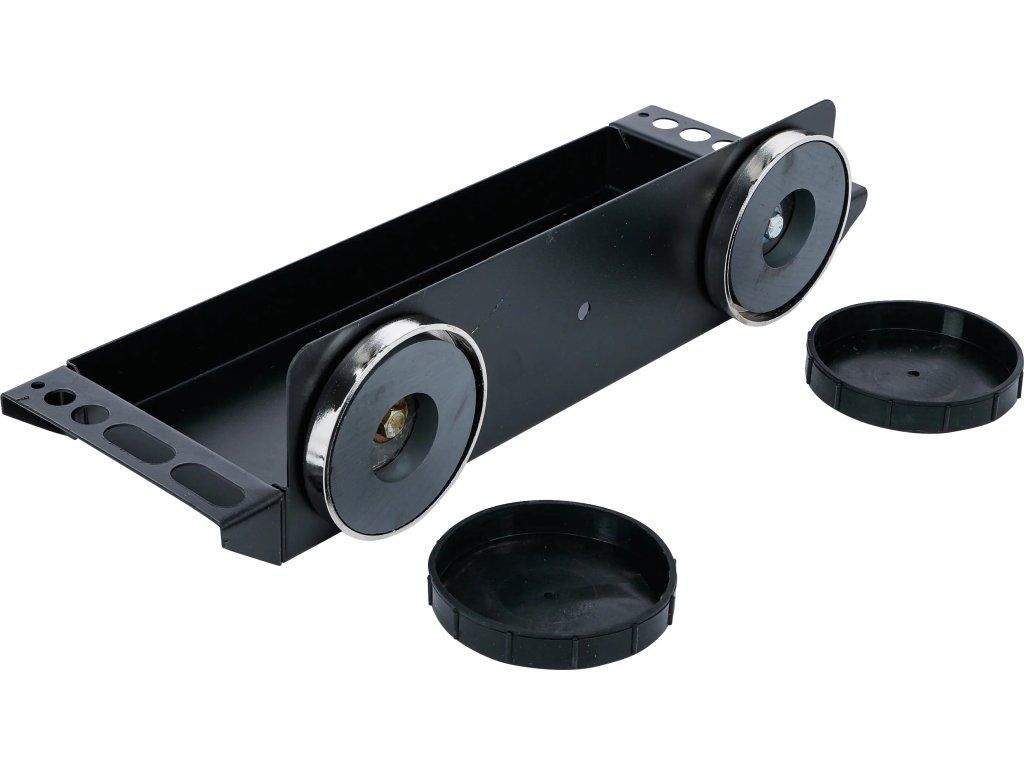 Praktická magnetická odkladacia miska na drobné diely a náradie s bočnými otvormi na skrutkovače, kliešte alebo škrabky. Šetrí miesto na pracovisku a drží pevne na kovových povrchoch.