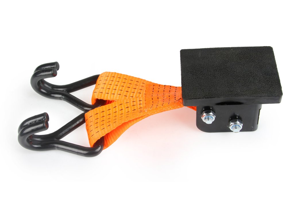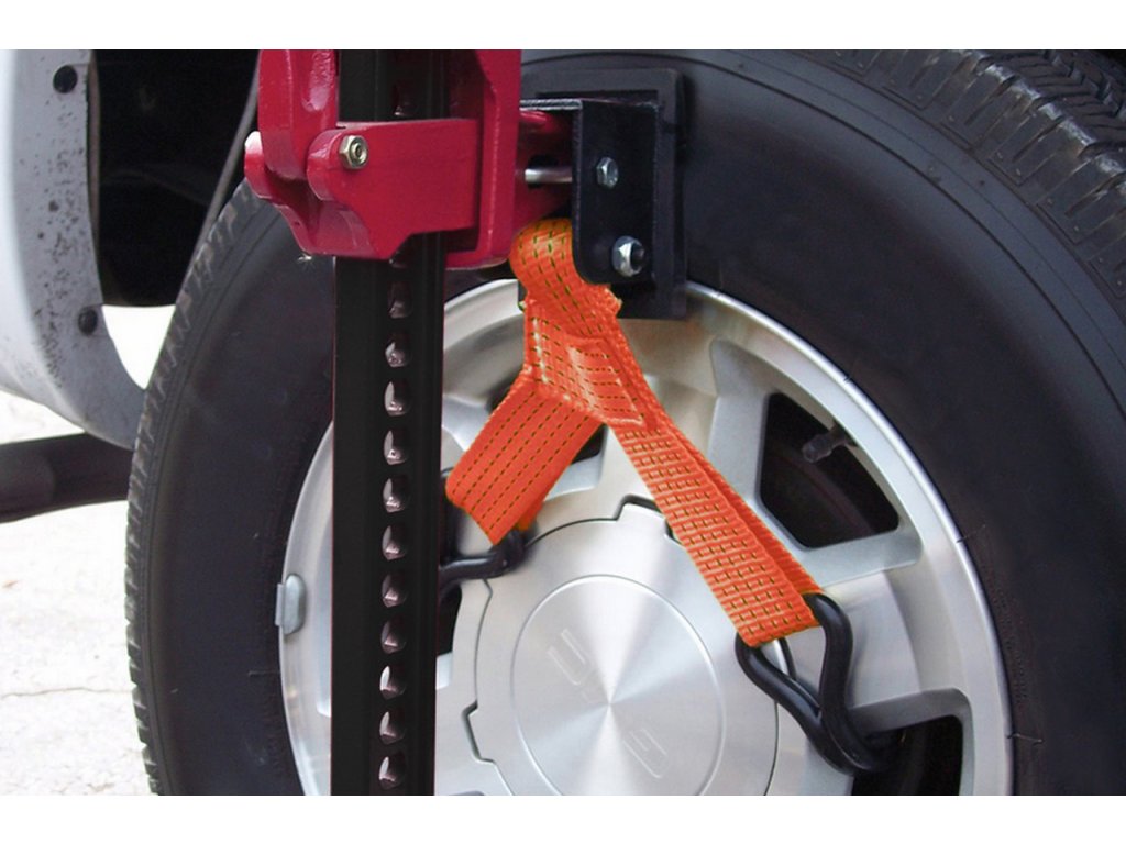 Univerzálny hák/držiak na uchytenie za okraj ráfika pri zdvíhaní kolesa farmárskym (Hi-Lift) zdvihákom. Stabilné, rýchle a bezpečné nadvihnutie bez poškodenia disku.
