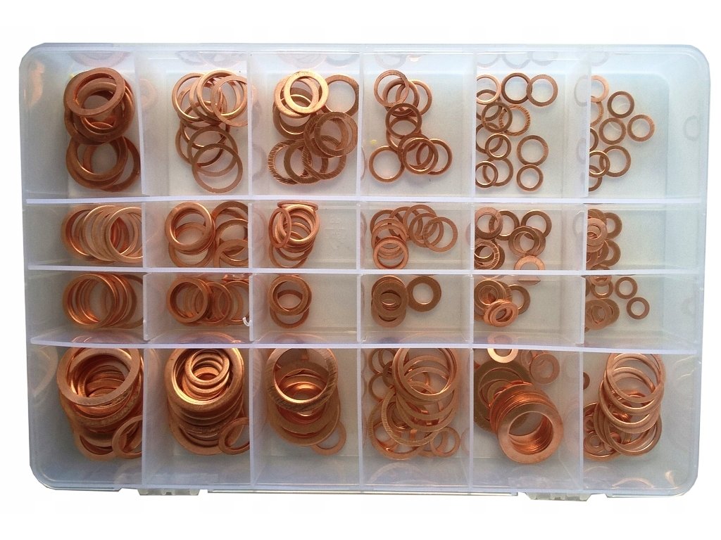 Praktická 300-dielna sada medených podložiek v rôznych rozmeroch. Určené na tesnenie olejových, palivových a hydraulických systémov.