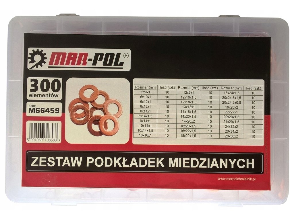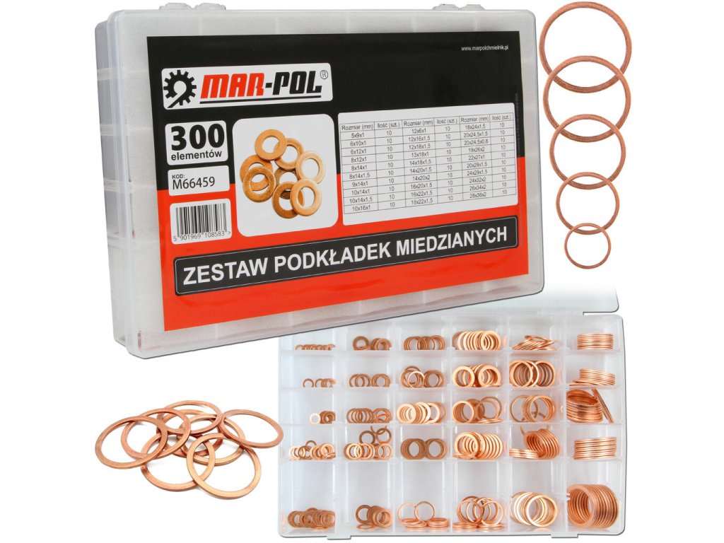 Táto sada obsahuje 300 kusov medených podložiek v najpoužívanejších rozmeroch. Medené podložky sú odolné voči vysokým teplotám, tlaku a korózii, preto sú ideálne na tesnenie olejových, palivových, hydraulických a pneumatických systémov. Všetko je uložené v plastovom kufríku, ktorý umožňuje prehľadné roztriedenie podľa veľkostí.