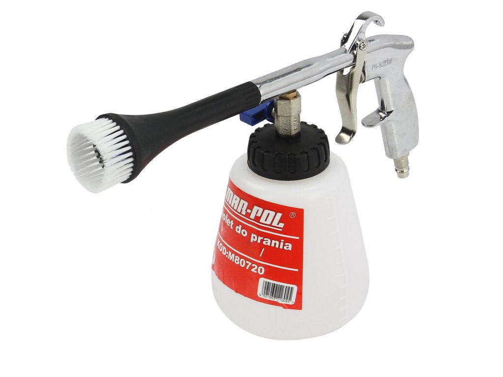 Pneumatická čistiaca pištoľ Marpol M80720 TORNADO je nástroj určený na efektívne a šetrné čistenie interiérov vozidiel a iných povrchov. Vďaka špeciálne tvarovanej tryske s rotujúcim jadrom vytvára pod tlakom stlačeného vzduchu penový roztok, ktorý dôkladne čistí aj ťažko dostupné miesta bez nadmerného navlhčenia povrchu. Pištoľ je ideálna na čistenie čalúnenia, klimatizačných výduchov, plastových dielov, sklenených komponentov, sedadiel, rohoží a iných odolných a ťažko odstrániteľných nečistôt. Je vhodná pre autodielne, detailingové štúdiá aj domáce použitie.