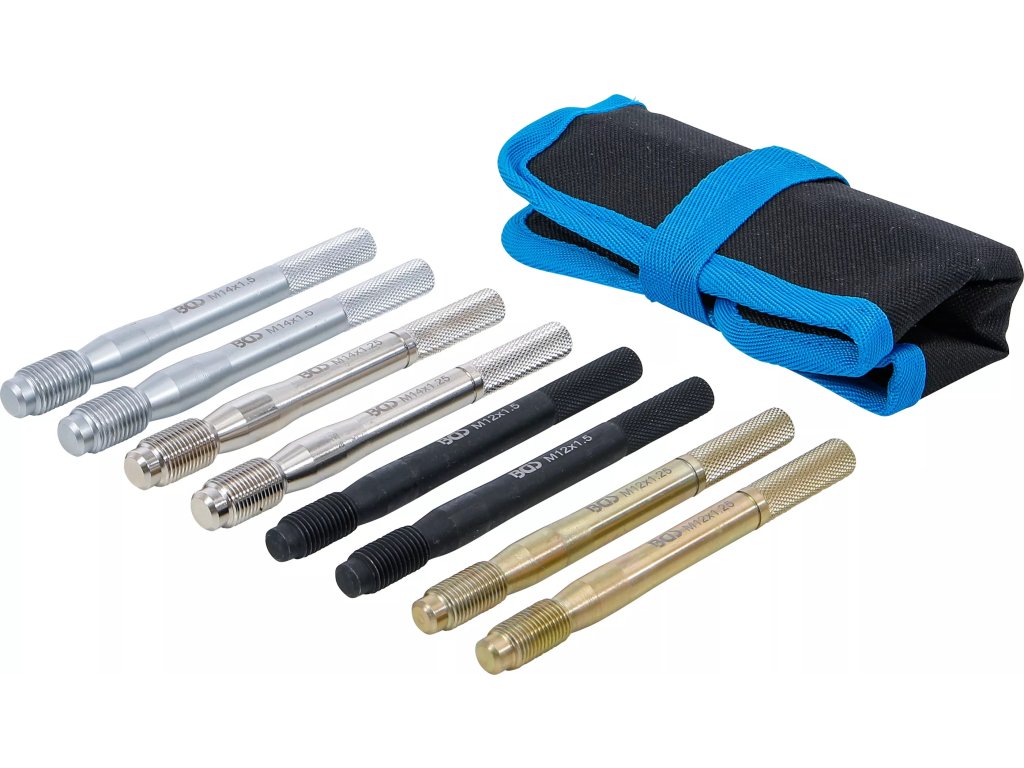 Univerzálna sada 8 vodicích skrutiek na jednoduché a bezpečné nasadenie kolesa na náboj. Štyri najčastejšie závity M12×1,25 / M12×1,5 / M14×1,25 / M14×1,5, dĺžka 133 mm, vrúbkovanie pre istý úchop.