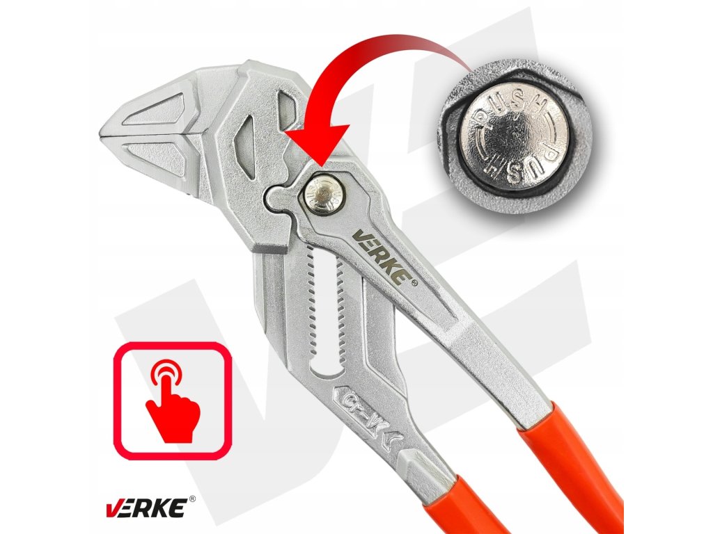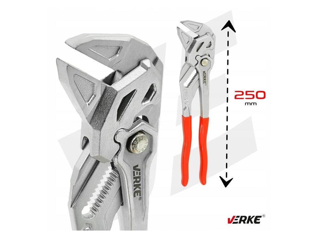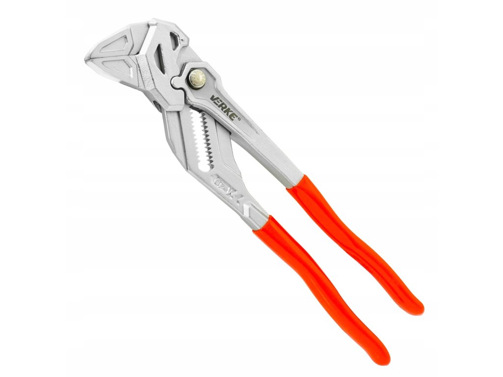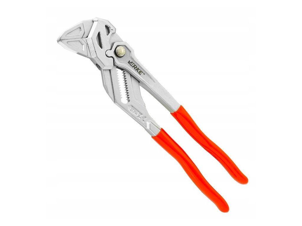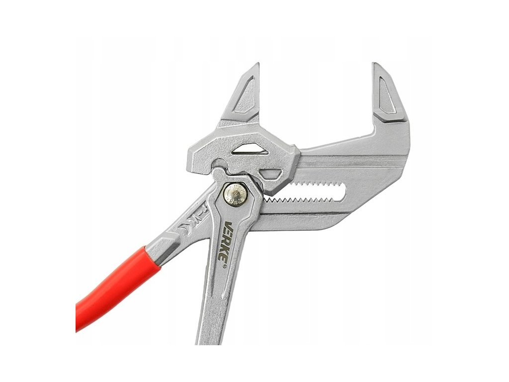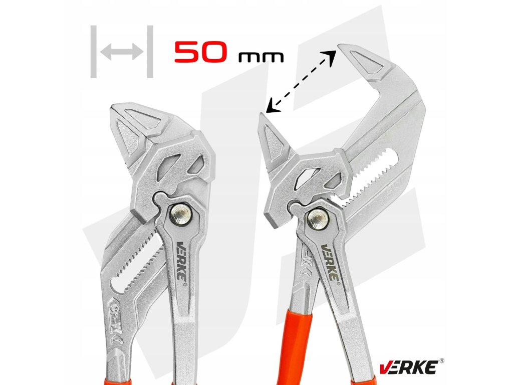 Nastaviteľné kliešte VERKE 250 mm z Cr-V ocele s maximálnym rozovretím čeľustí 50 mm. Presné profilovanie, bezpečný úchop a blokovací mechanizmus umožňujú použitie ako kľúč aj ako univerzálne montážne kliešte.