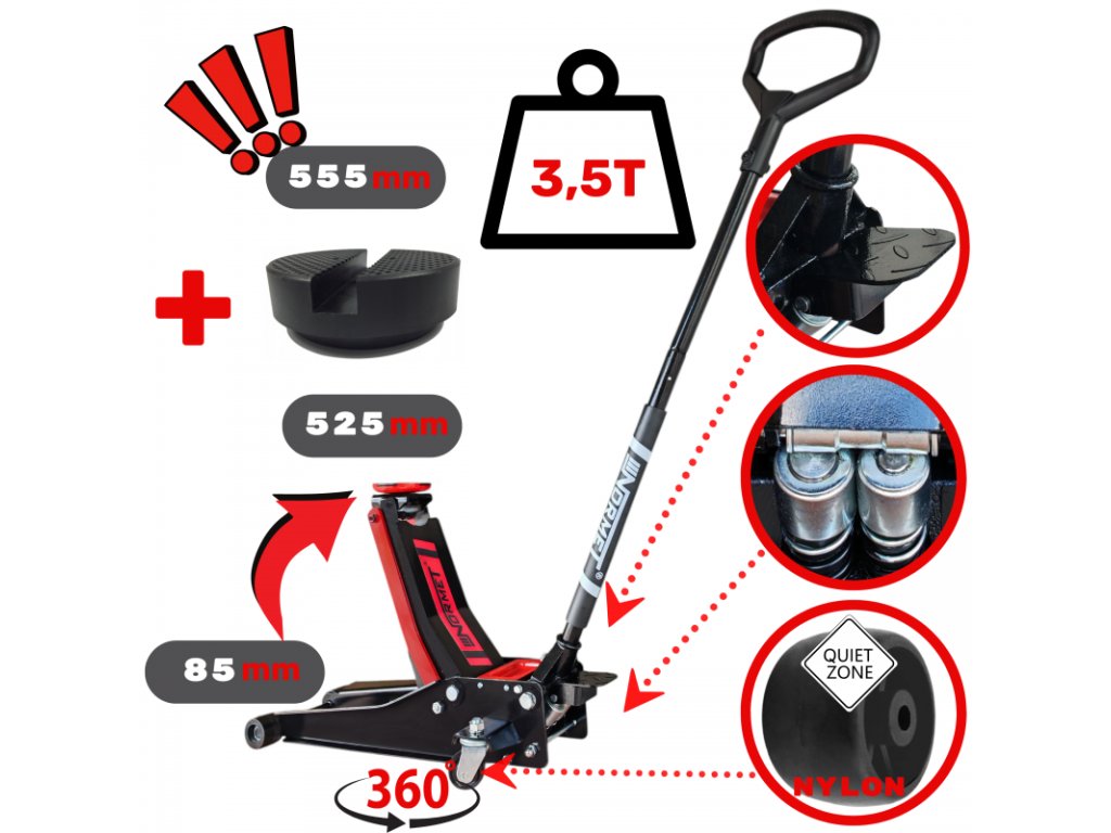 Silný a kompaktný dielenský zdvihák s nosnosťou 3 500 kg. Nízky profil 85 mm pre športové a znížené autá, pracovná výška až 520 mm, hmotnosť 30 kg