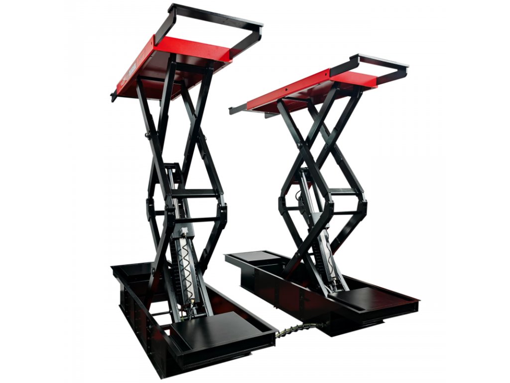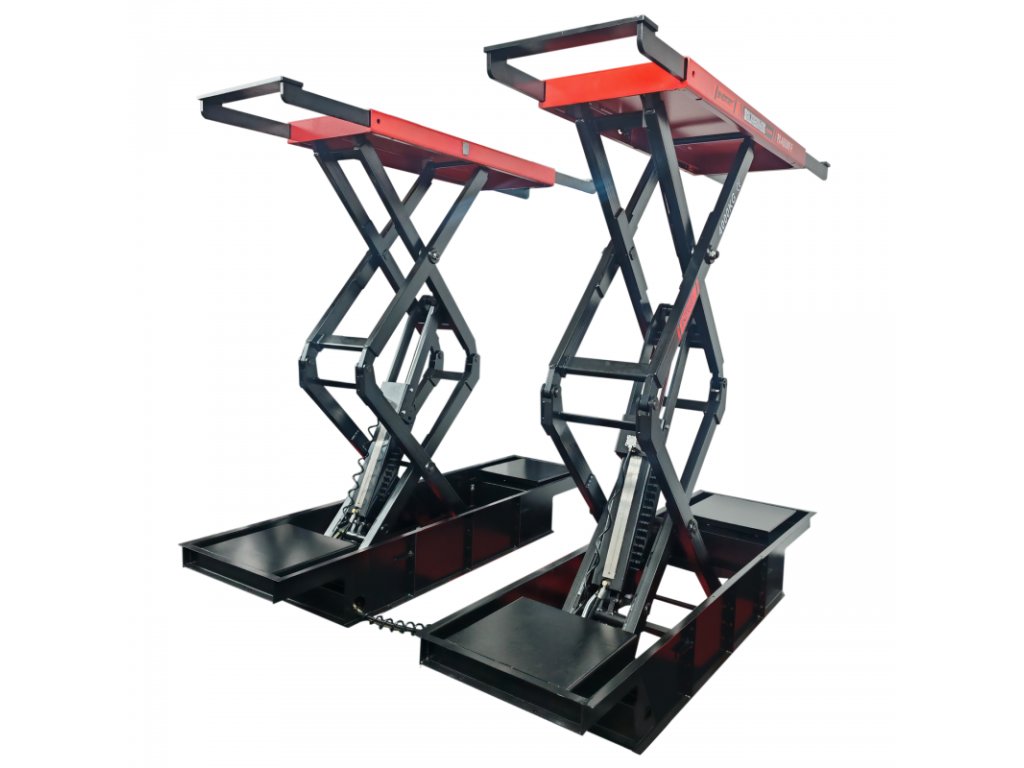 Profesionálny podlahový nožnicový zdvihák s nosnosťou 4 000 kg a zdvihom až 2 190 mm, dodávaný v sade so základovými kazetami. Posuvné rampy, pneumatické bezpečnostné západky a laserová synchronizácia z neho robia ideálne riešenie pre moderné autoservisy.