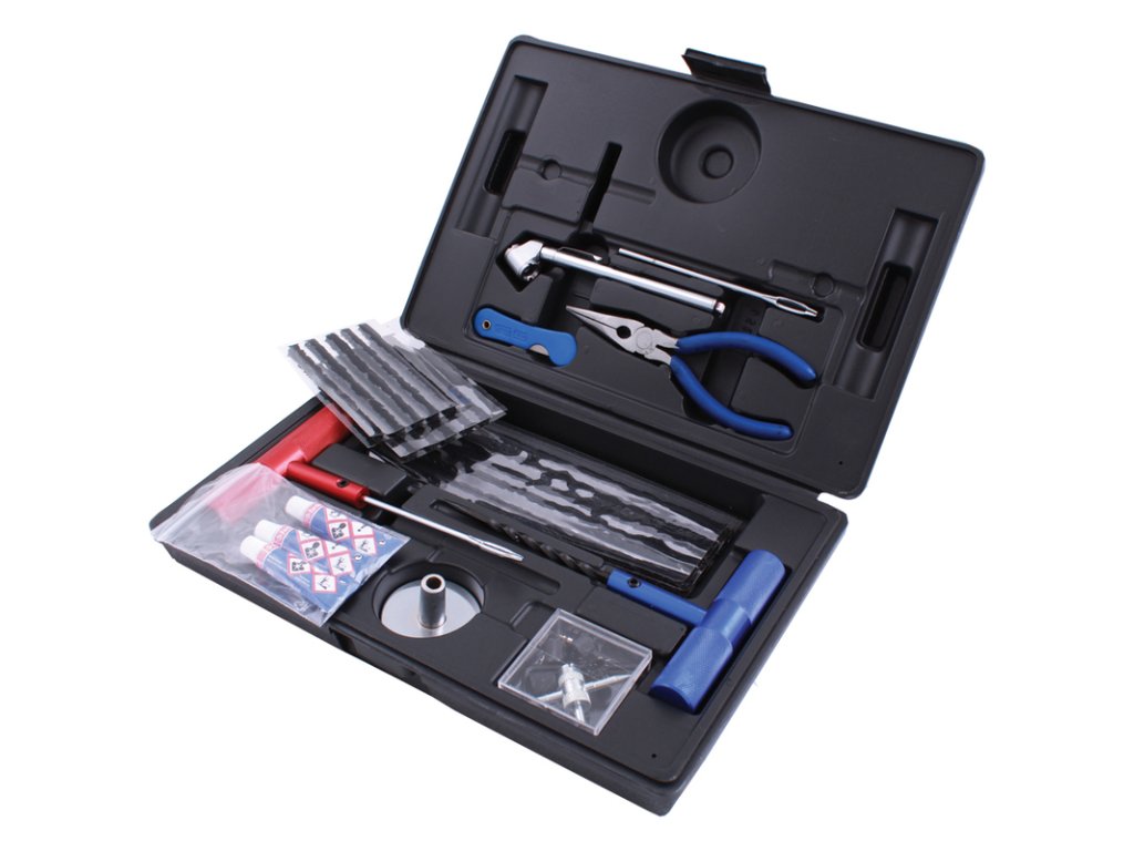 Súprava na opravu bezdušových pneumatík. Zabalená v kufríku.