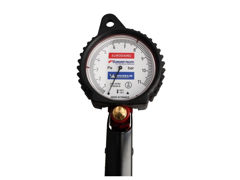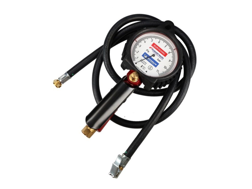 Profesionálny pneuhustič Schrader/Michelin EURODAINU s rozsahom 0,7–11 bar, veľkým 80 mm manometrom a 1,5 m hadicou. Presné meranie, kalibračný certifikát a robustná konštrukcia dávajú pocit istoty pri každom nafúkaní pneumatík