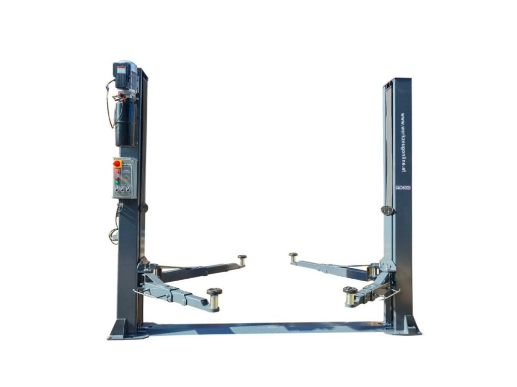 Znížený dvojstĺpový zdvihák Profi Line s nosnosťou 4 tony a automatickým odistením západiek. Vhodný aj do nižších dielní