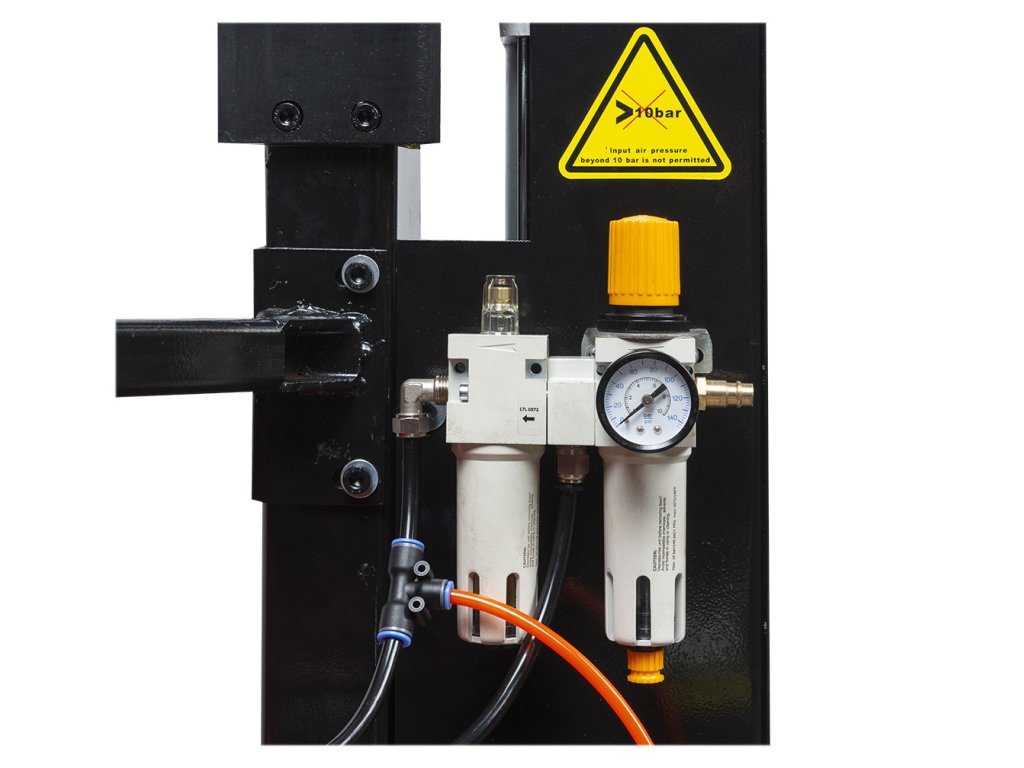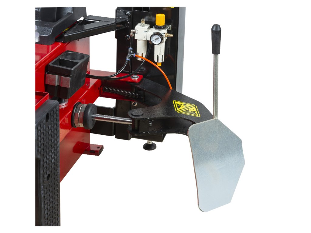 Zväčšený pracovný stôl umožňuje manipuláciu s diskami až do 26". Výkonný zrážač pätky s nastaviteľným dorazom dosahuje silu 2500 kg.