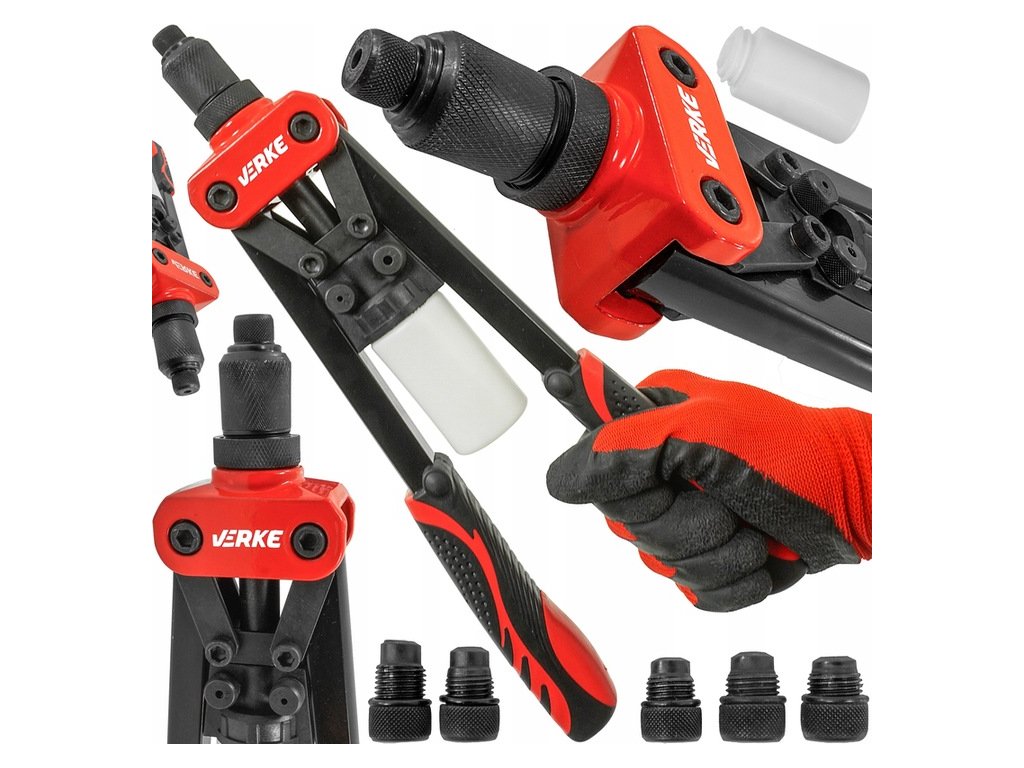 Ručné nitovacie pákové kliešte určené pre hliníkové, medené, oceľové a nerezové trhacie nity v rozsahu od 3,2 mm do 4,8 mm. Telo a rukoväť z uhlíkovej ocele. Sťahovací mechanizmus má tri čeľuste. Vďaka vhodnej hrúbke steny a správne zvolenej dĺžke ramena môžeme nitovačku používať bez vynaloženia väčšej sily. Nádoba na zlomené jadrá nitov pomáha udržiavať pracovisko čisté.