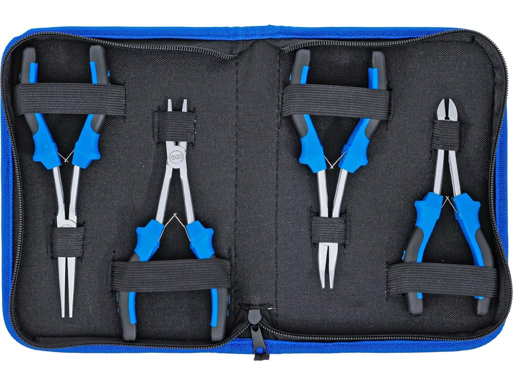 Kompaktná 4-dielna sada extra dlhých elektrikárskych klieští BGS so štíhlym dlhým krkom, vnútornou pružinou a 2-komponentnými rukoväťami. Ideálna na čistú, presnú prácu v ťažko prístupných miestach