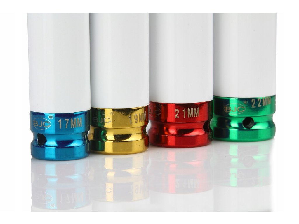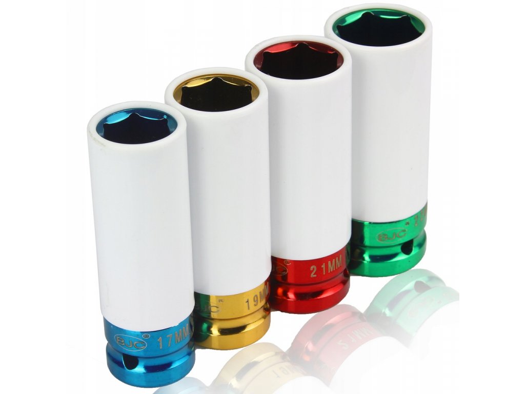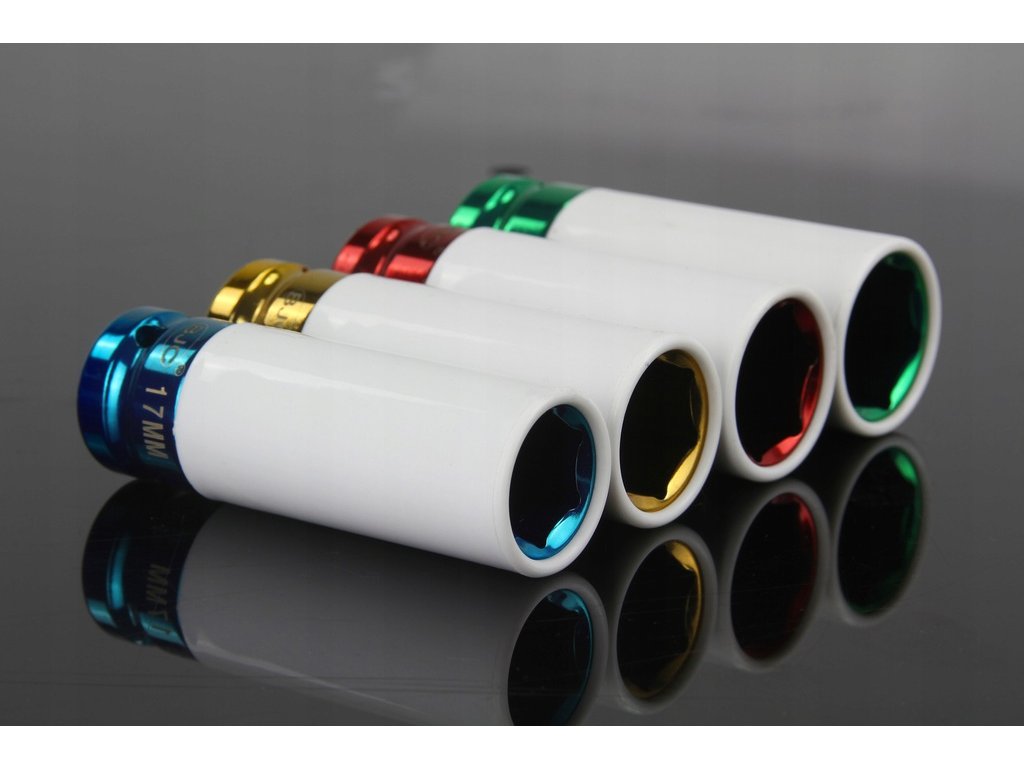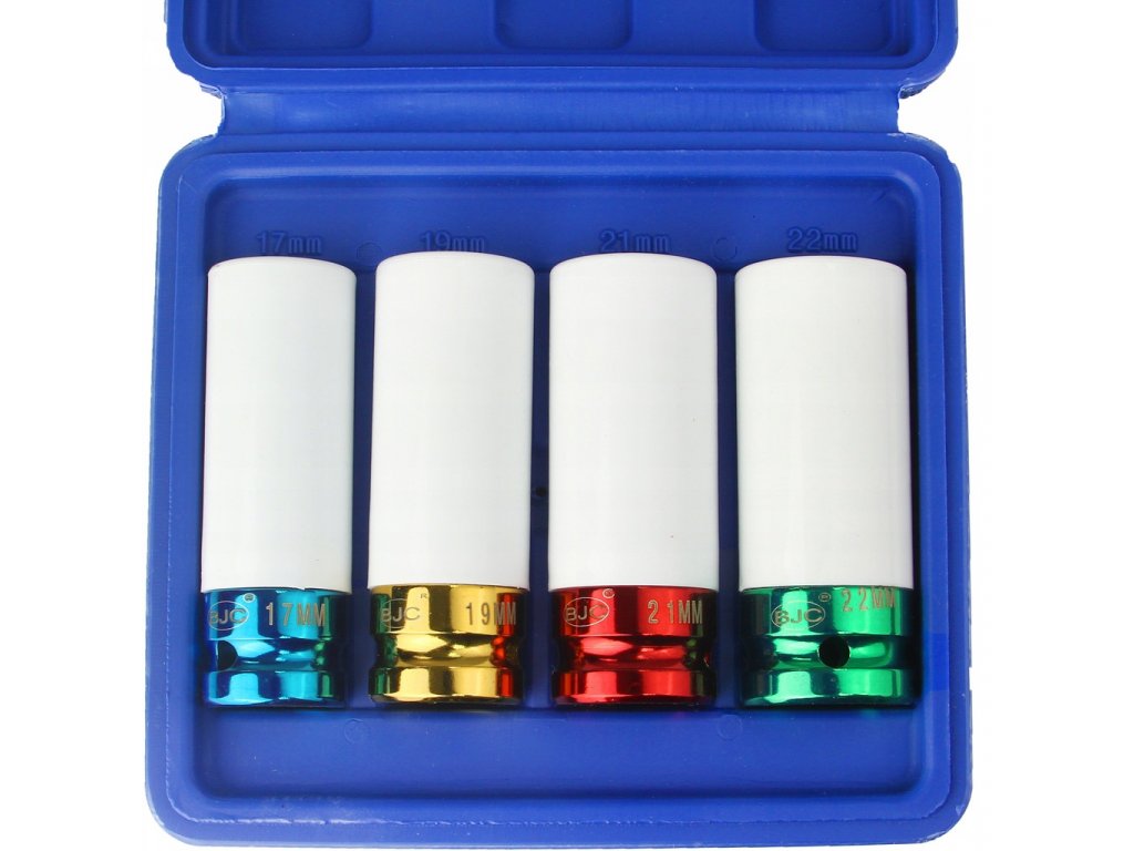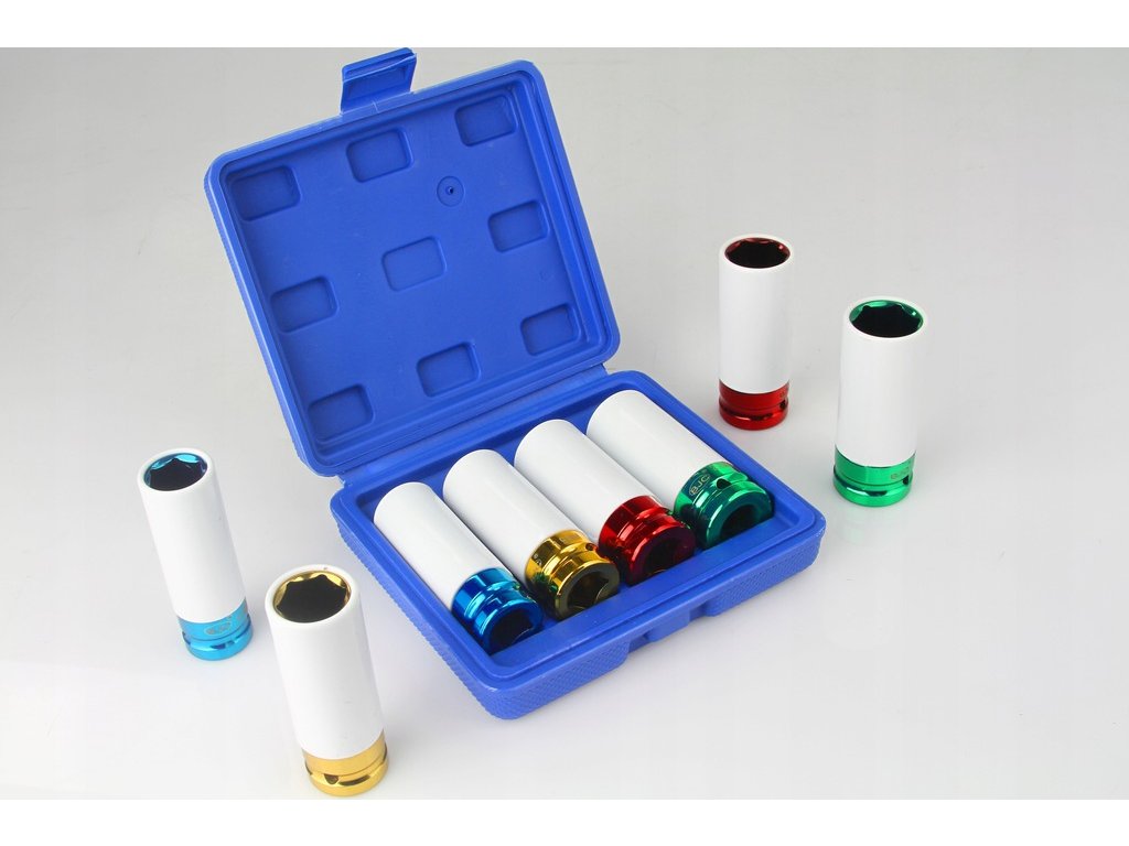 Sada je určená na bezpečné povoľovanie a uťahovanie skrutiek/ matíc ALU diskov rázovým uťahovákom 1/2". Každá hlavica má ochrannú plastovú otulinu, ktorá chráni lak a hranu disku pred škrabancami a odlupovaním náteru. Hlavice z chróm-vanádiovej ocele (CrV) znesú dlhodobú záťaž v pneuservise, dĺžka 80 mm uľahčí prístup v hlbších lôžkach. Farebné rozlíšenie (17–červená, 19–zlatá, 21–modrá, 22–zelená) urýchľuje výber správneho rozmeru. Dodávané v praktickom kufríku.