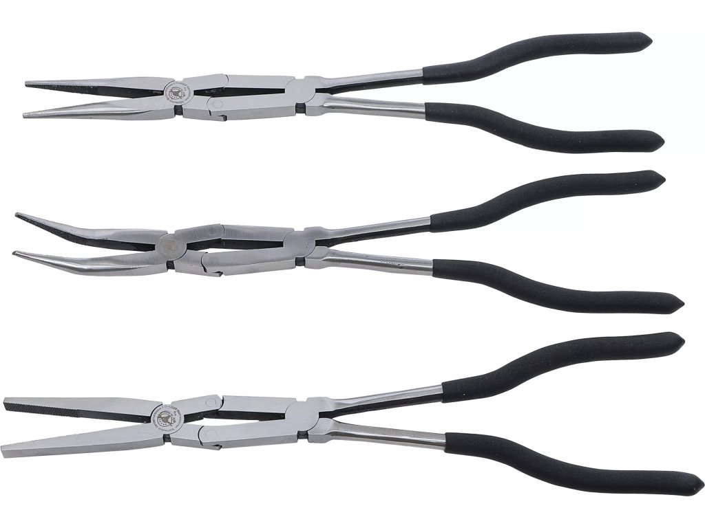 Profesionálna 3-dielna sada klieští s dvojitým kĺbom, navrhnutá pre prácu v stiesnených priestoroch, kde je potrebné veľké otvorenie čeľustí pri minimálnom roztvorení rukovätí.