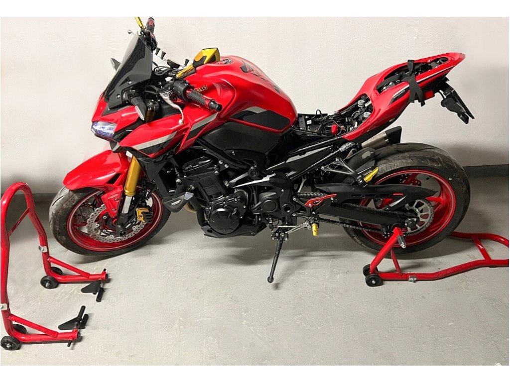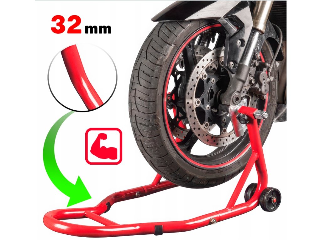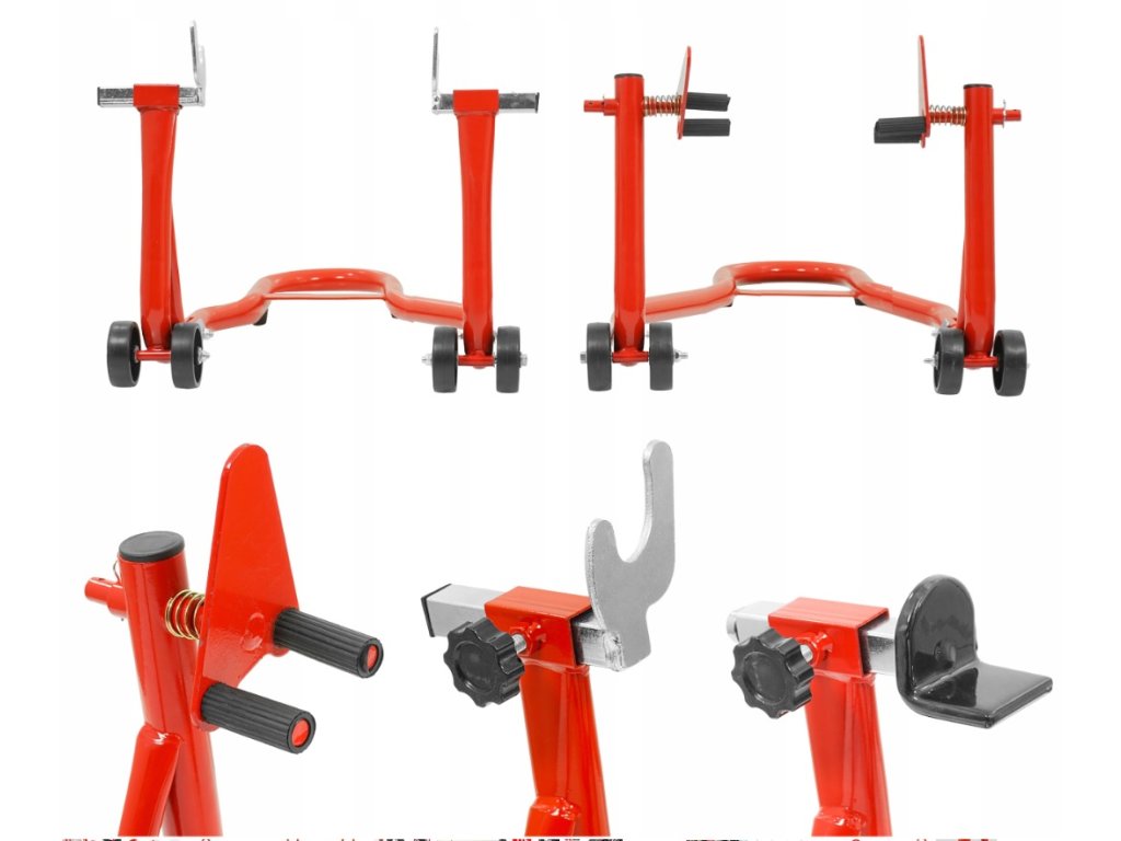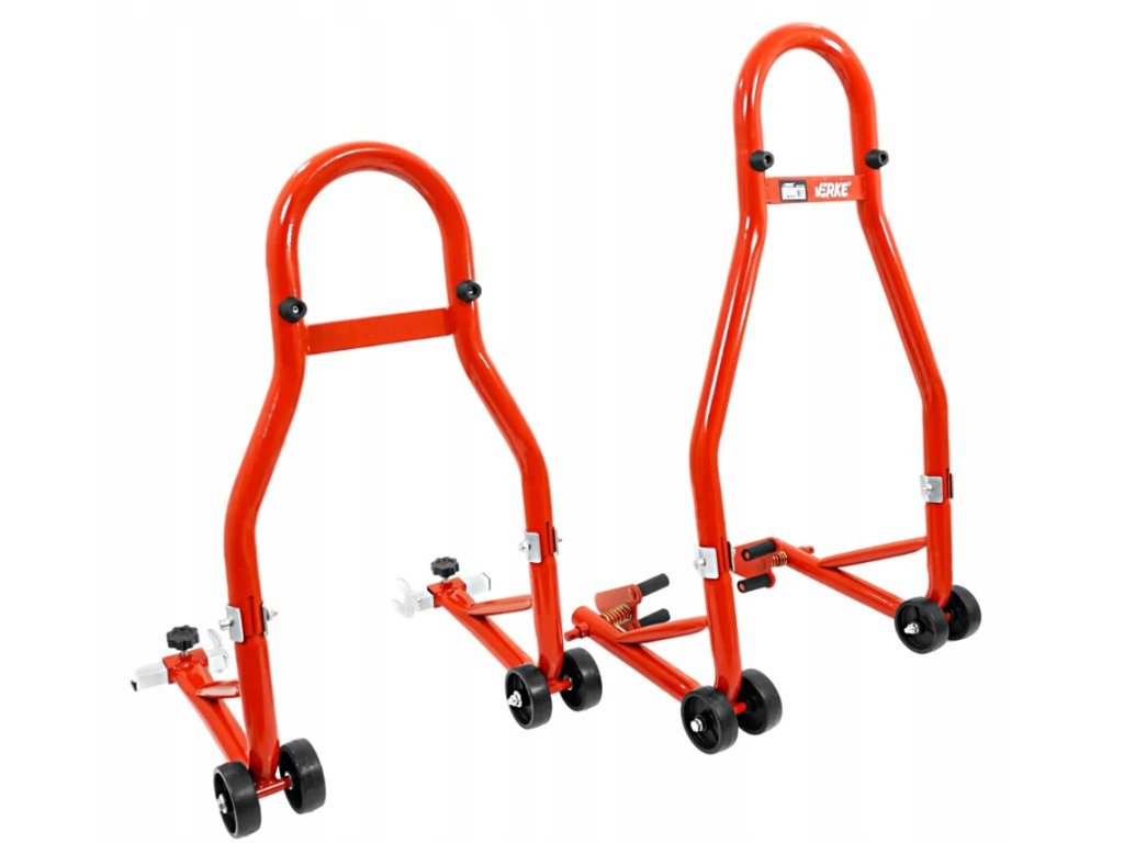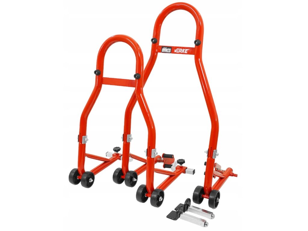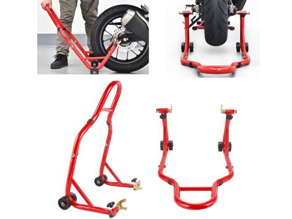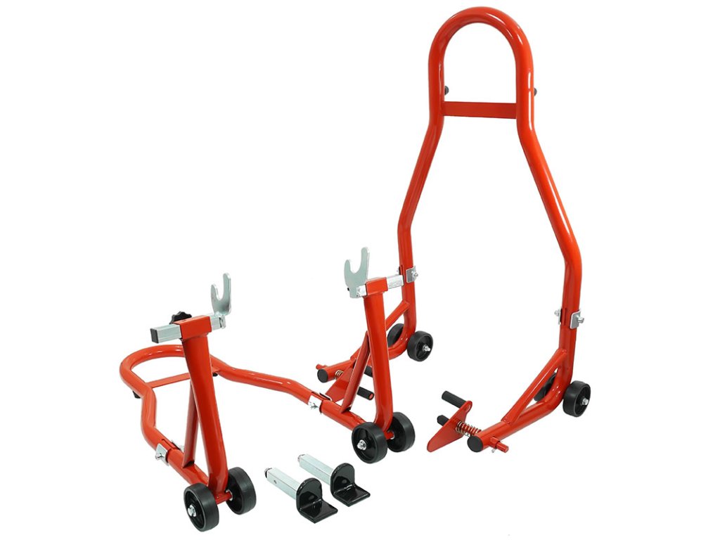 Univerzálna sada stojanov na zdvih prednej aj zadnej časti motocykla. Zadný stojan stabilne podoprie kyvnú vidlicu – či už cez diabolky (V-adaptér), alebo priamo cez pogumované pätky. Predný stojan zdvíha pod spodky predných klzákov/vidlice pomocou pogumovaných lyžín, čo je ideálne na demontáž predného kolesa, čistenie bŕzd či kontrolu ložísk.