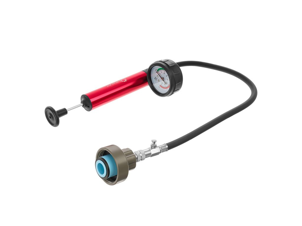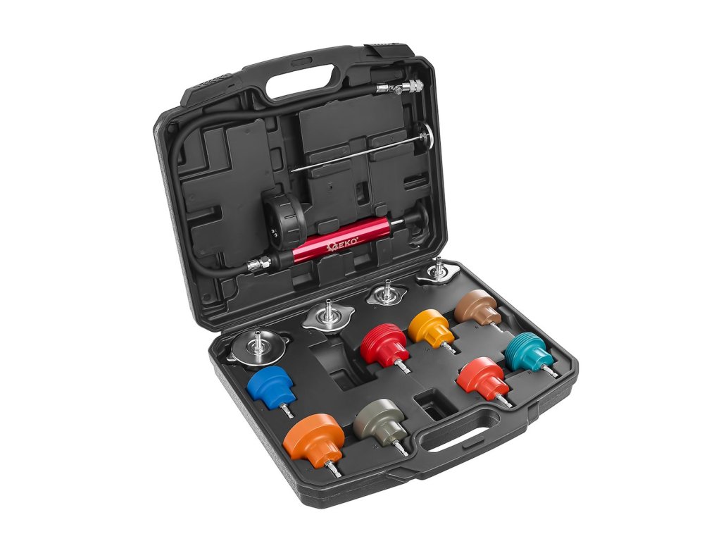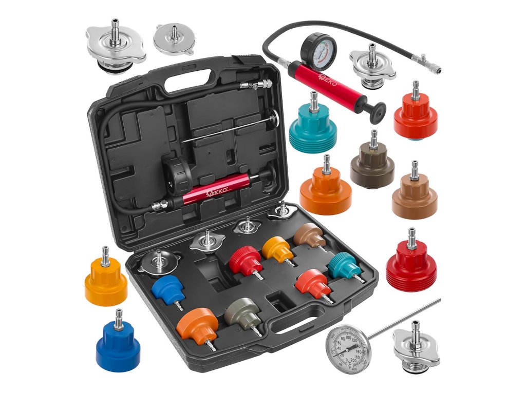 Tlaková sada na kontrolu tesnosti chladiaceho systému vozidla. Umožňuje identifikovať netesnosti bez potreby demontáže dielov, vďaka univerzálnym adaptérom pre väčšinu chladiacich systémov.