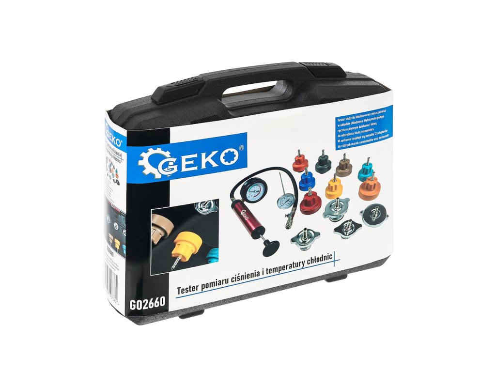 Sada GEKO G02660 je určená pre autoservisy a mechanikov, ktorí potrebujú rýchlo a presne diagnostikovať poruchy chladiaceho systému – netesnosti, poškodené tesnenia, kryty chladiča či rám chladiča. S touto sadou ľahko otestujete systém pod tlakom, odhalíte úniky vody alebo CO₂, čím predídete prehriatiu motora a jeho poškodeniam.
