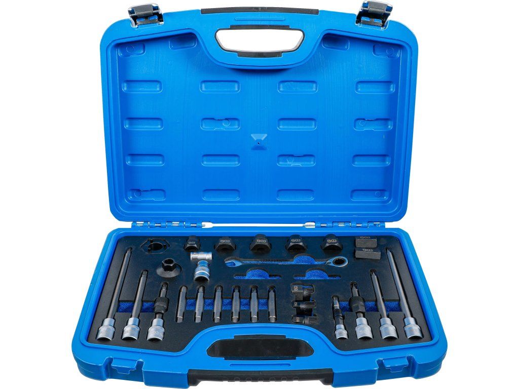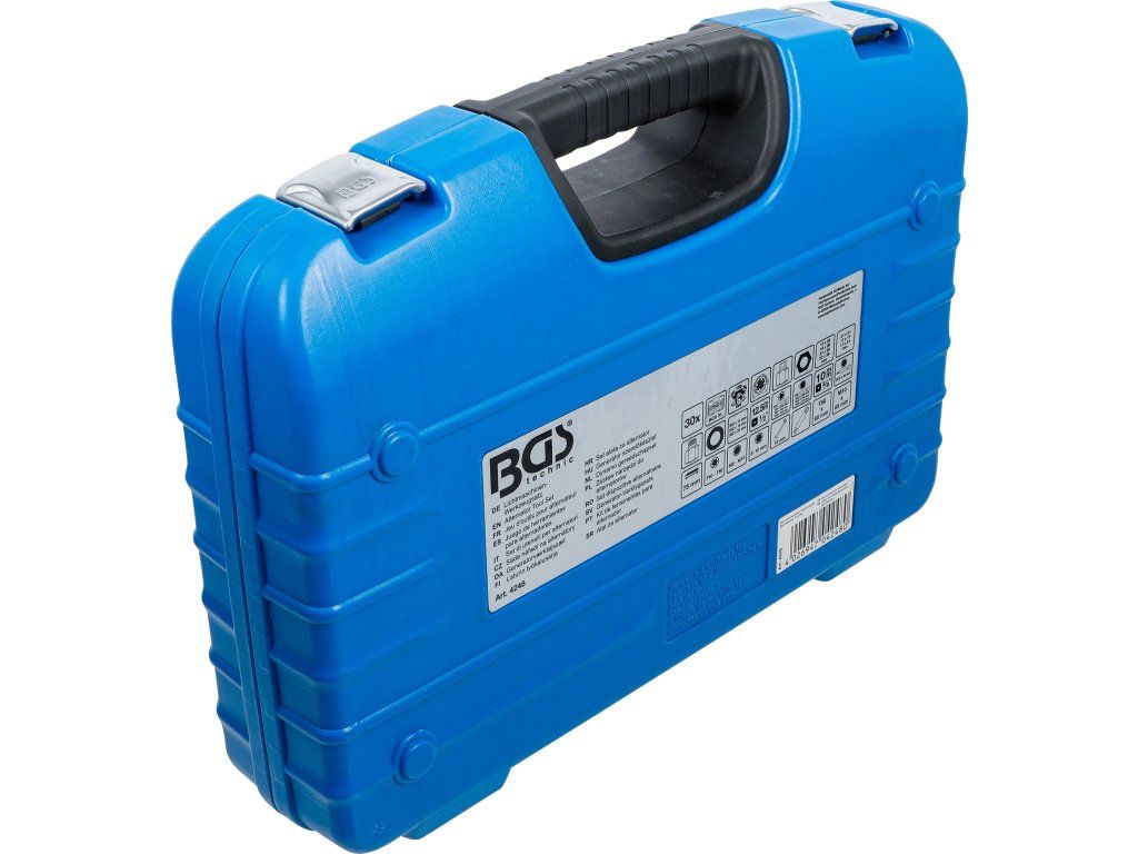 Sada náradia na alternátory 30 ks je špeciálne servisné vybavenie určené na demontáž remeníc alternátora. Vďaka širokej zostave špeciálnych hlavíc, bitov a kľúčov umožňuje bezpečnú a presnú prácu pri servise alternátorov bez poškodenia remenice alebo hriadeľa.