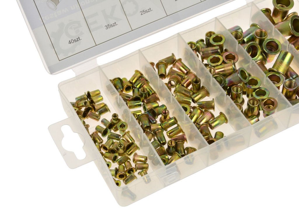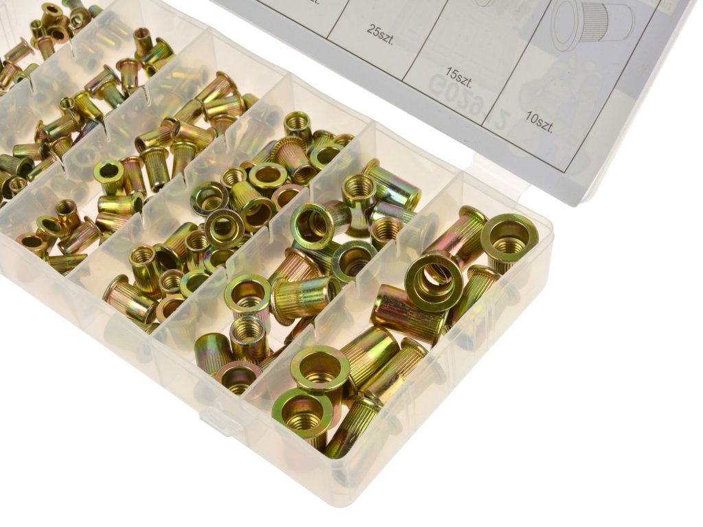 150 dielna sada oceľových nitovacích matíc v 6 obľúbených veľkostiach M3 - M10. Kompatibilné s armatúrami správnej veľkosti závitu.