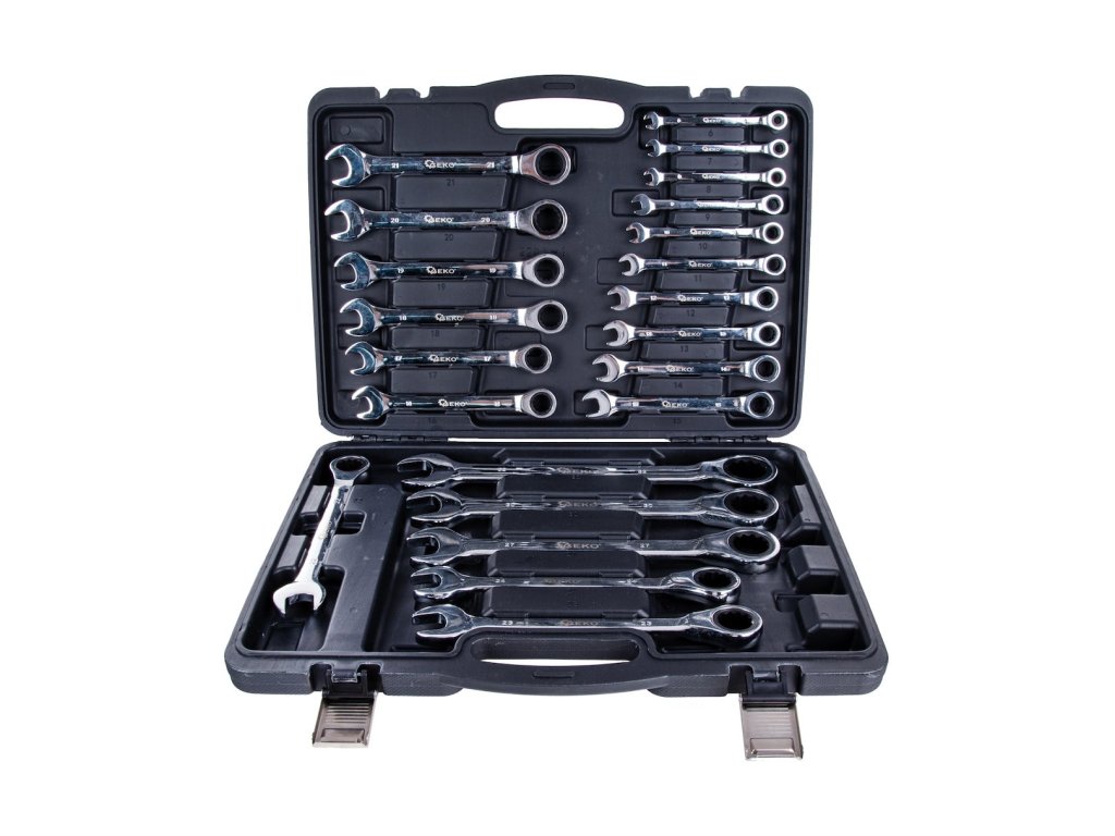 22-dielna sada račňových očkovo-vidlicových kľúčov 6–32 mm v kufríku je vhodná na profesionálne aj domáce použitie. Račňové očko so 72 zubmi umožňuje prácu už pri uhle 5° a uľahčuje povoľovanie aj doťahovanie v stiesnenom priestore.