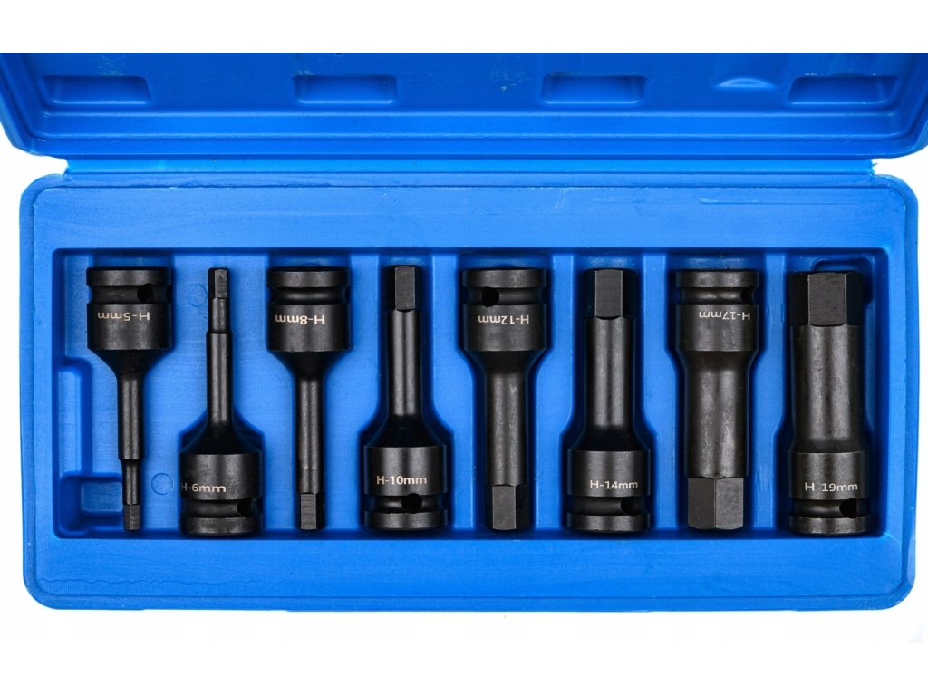 Sada HEX rázových nástrčných kľúčov vyrobených z vysoko kvalitnej chróm-molybdénovej ocele (Cr-Mo). Sada obsahuje 8 kusov nádstavcov vo veľkostiach H5-H19. 1/2 "zásuvky pre náročnú prácu s rázovými uťahovačmi s vysokým krútiacim momentom. Ideálne pre profesionálnu autodielňu.