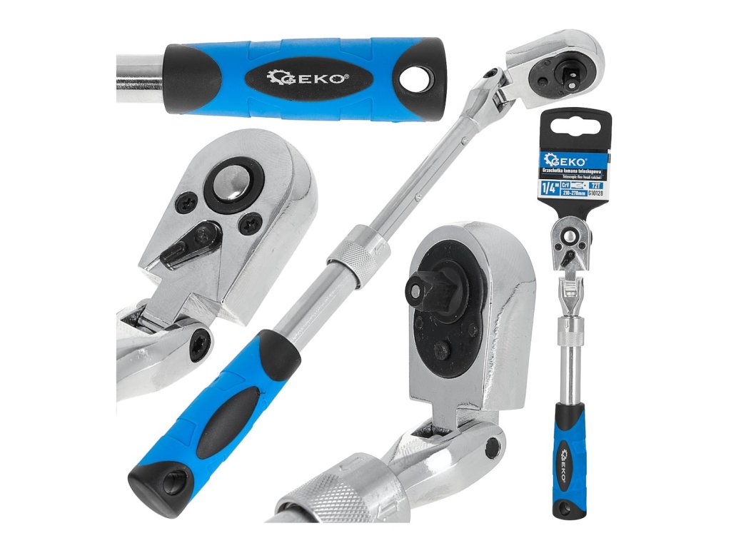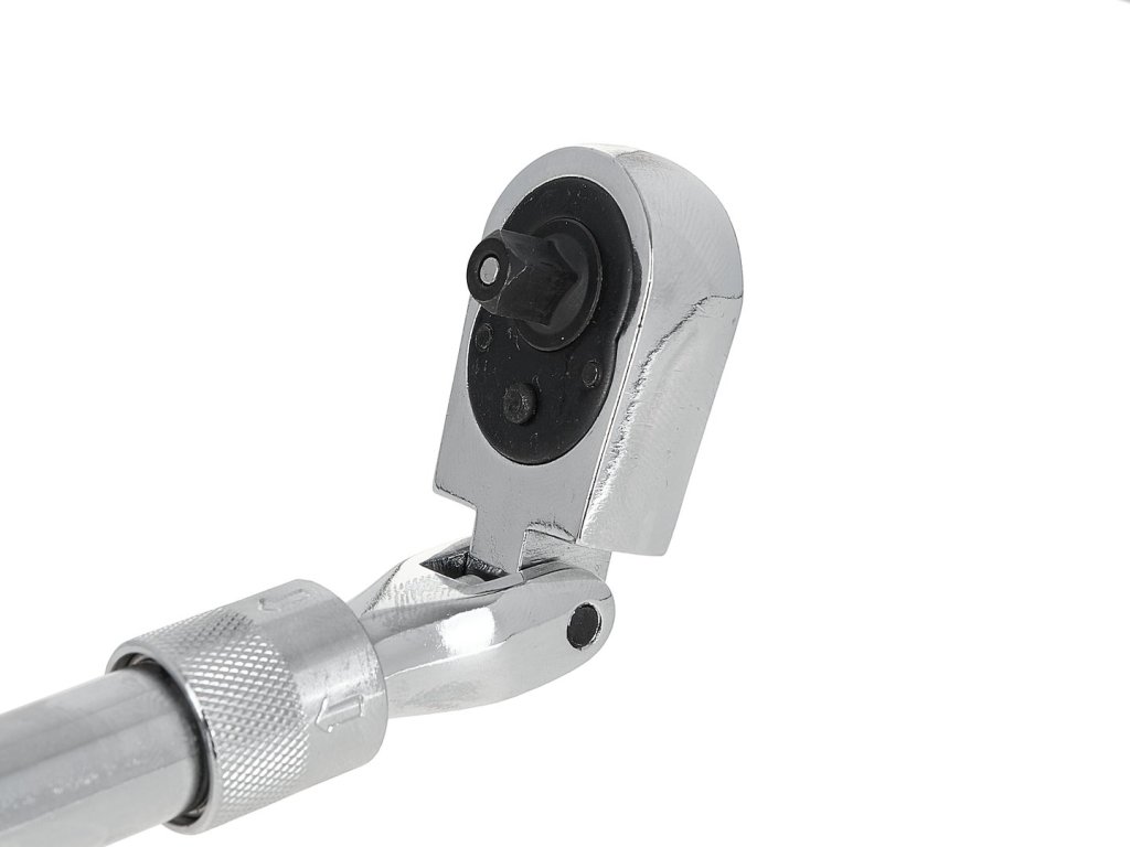 1/4″ teleskopická račňa z CrV ocele s kĺbovou hlavou, dĺžkou 210–278 mm a 72-zubeným mechanizmom (5° krok). Ergonomická protišmyková TPR rukoväť pre istý úchop.