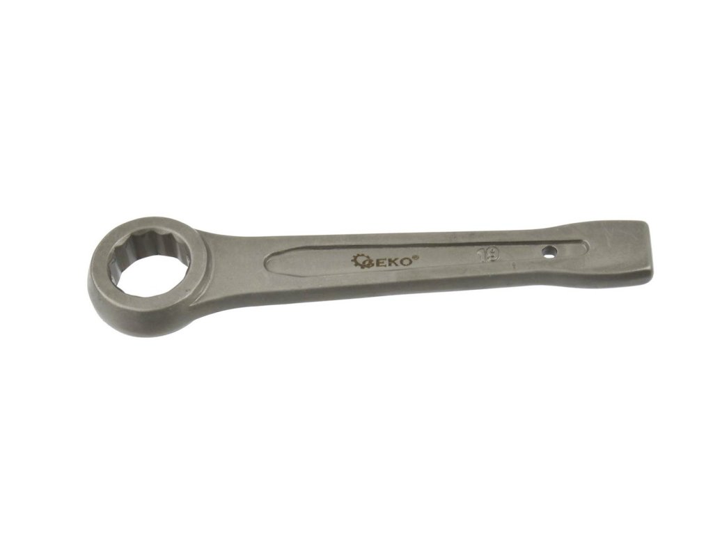 Masívny úderový očkový kľúč 19 mm z chróm-vanádiovej ocele, určený na povoľovanie a doťahovanie silno zatiahnutých skrutiek pomocou kladiva. Ideálny pre náročné dielenské a priemyselné použitie.