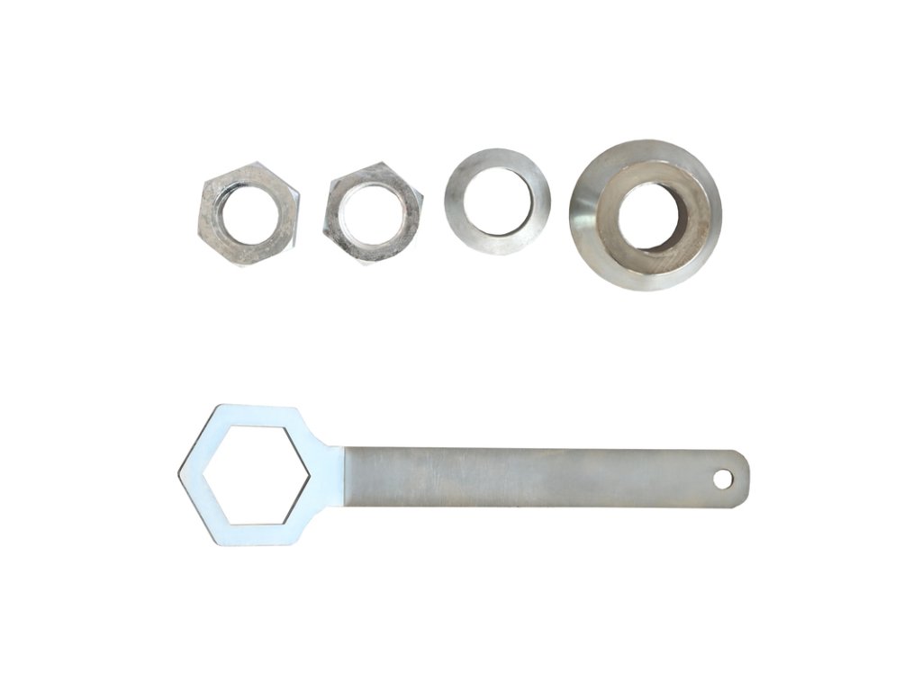 Adaptér pozostáva z robustnej upínacej hlavy so závitovou hriadeľou s priemerom 40 mm, ktorá zabezpečuje pevné a spoľahlivé uchytenie disku. Súčasťou sú dva centrovacie kužele pre rôzne priemery stredových otvorov diskov a dvojica zaisťovacích matíc, ktoré zaručujú stabilitu počas celého rovnacieho procesu.