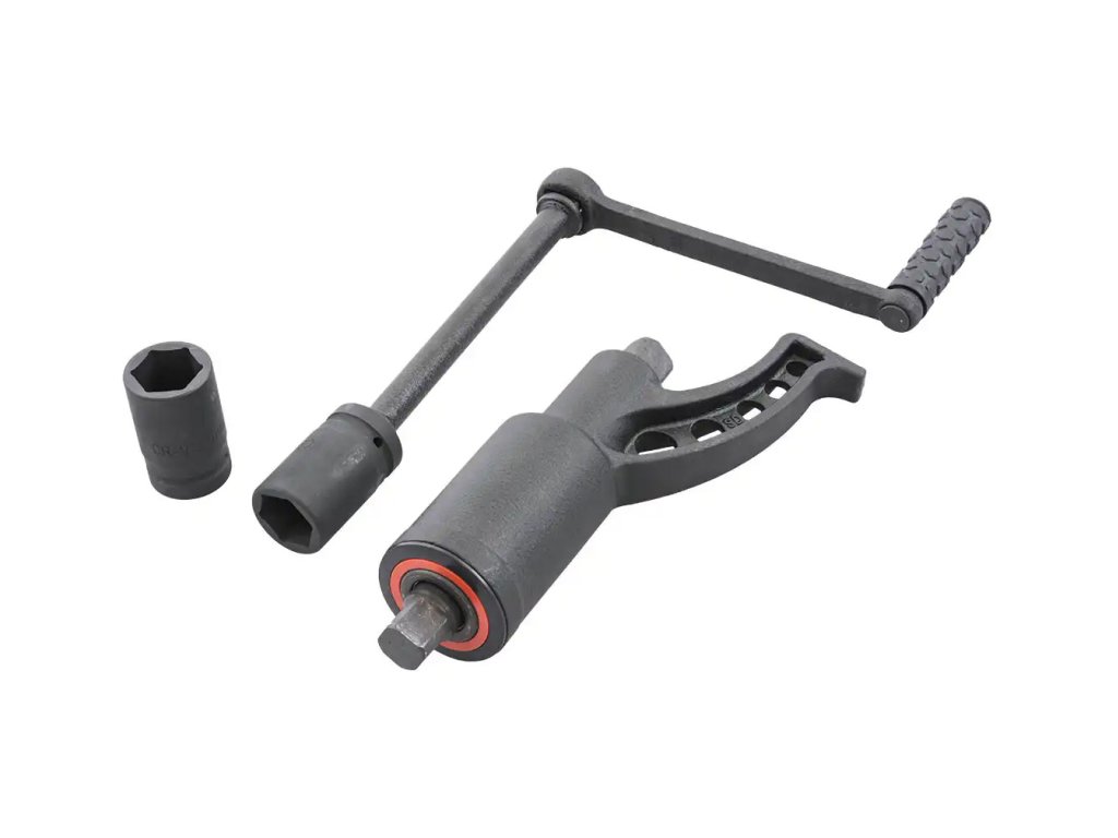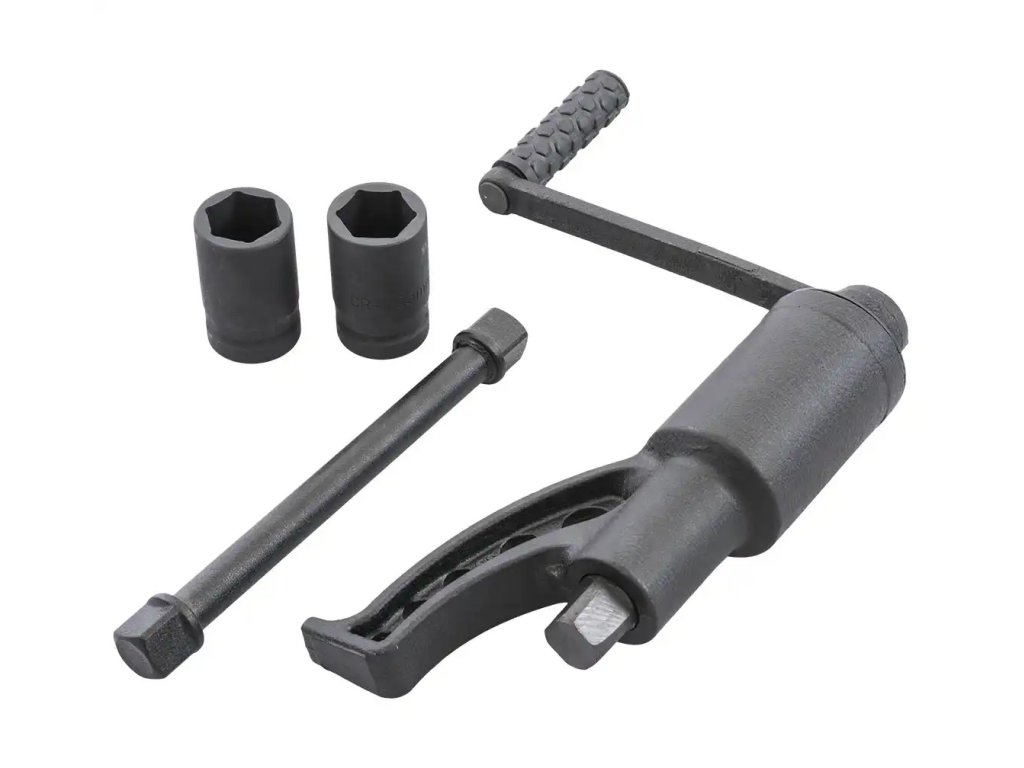 Nainštalujte kľuku a objímku a umiestnite kľúč na koleso. Zaistite opornú nohu o najbližšiu skrutku – postupujte v smere hodinových ručičiek. Potom ho začnite odskrutkovať pomocou kľuky.