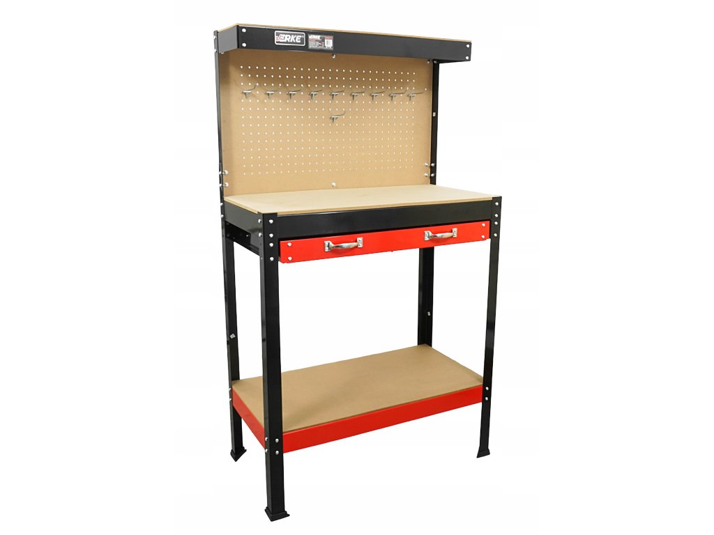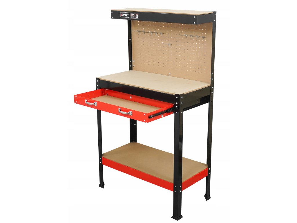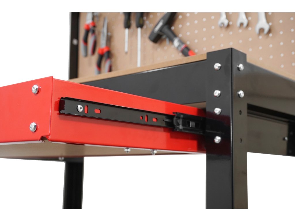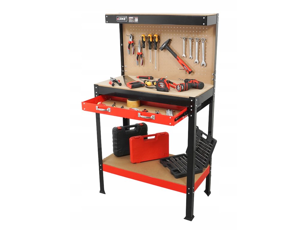 Komfortný stôl do garáže alebo dielne s pevnou oceľovou konštrukciou, MDF pracovným panelom 79,5 × 39,5 cm, zásuvkou a perforovaným panelom s 10 háčikmi pre usporiadanie náradia.