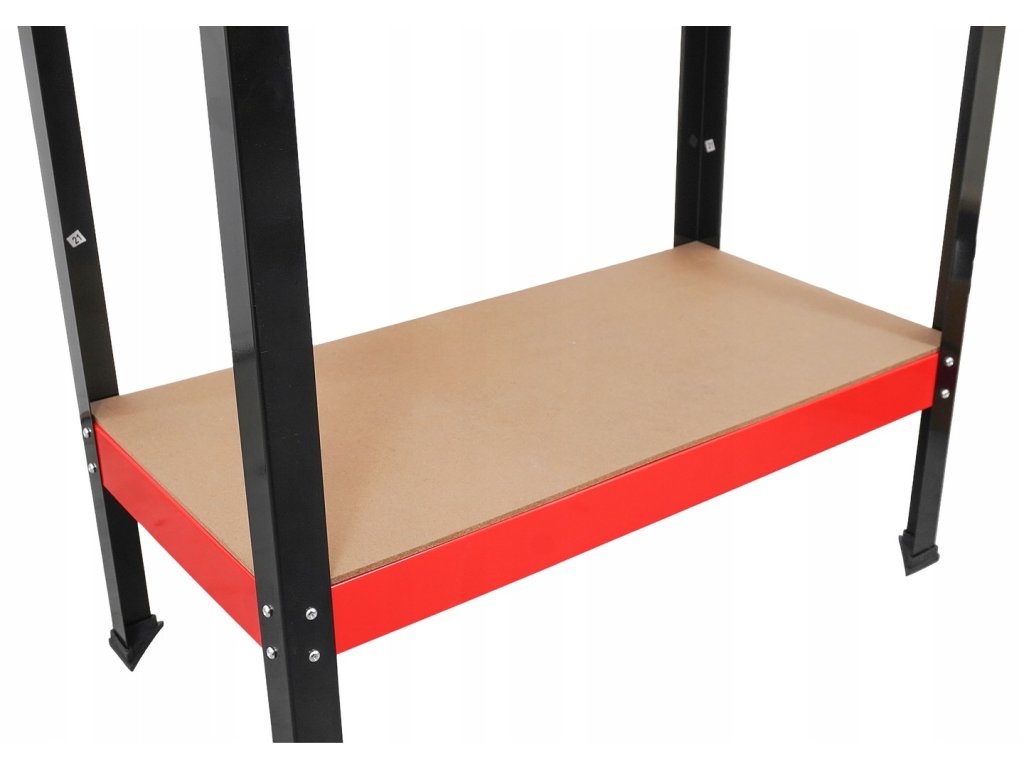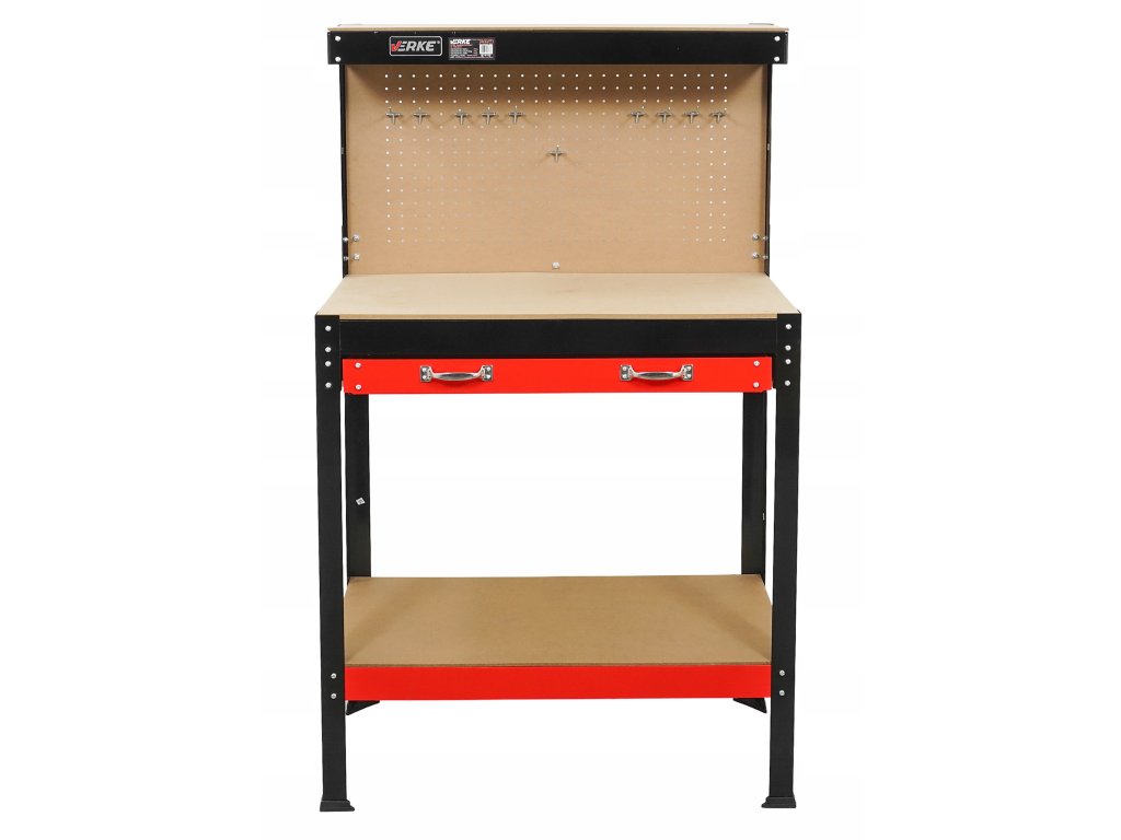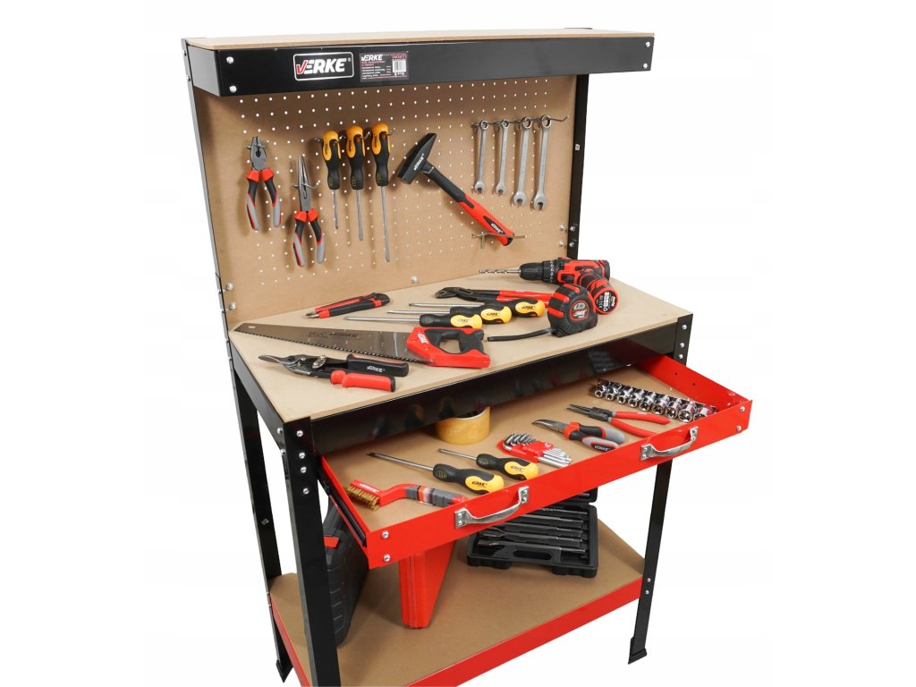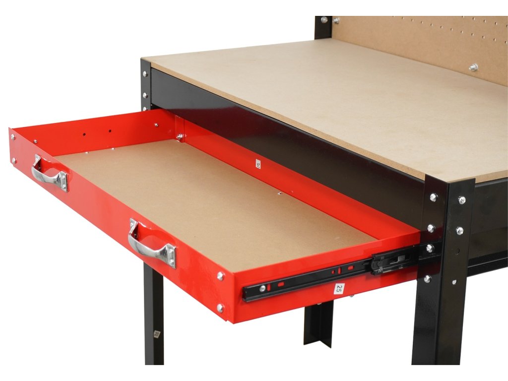 Komfortný stôl do garáže alebo dielne s pevnou oceľovou konštrukciou, MDF pracovným panelom 79,5 × 39,5 cm, zásuvkou a perforovaným panelom s 10 háčikmi pre usporiadanie náradia.