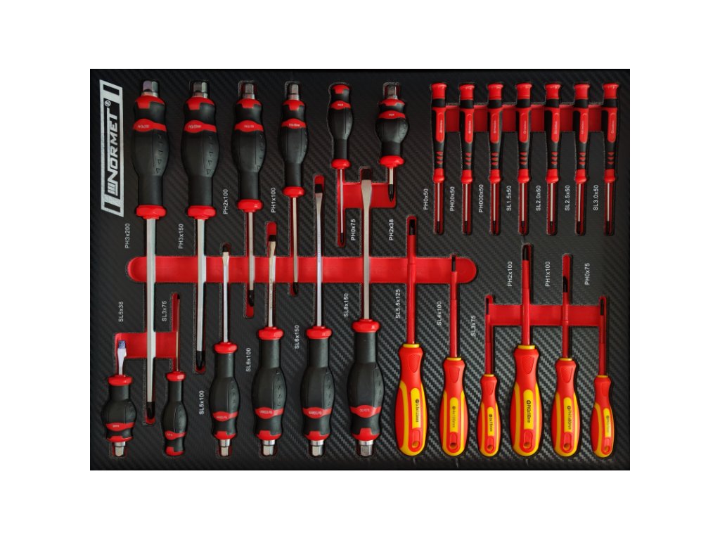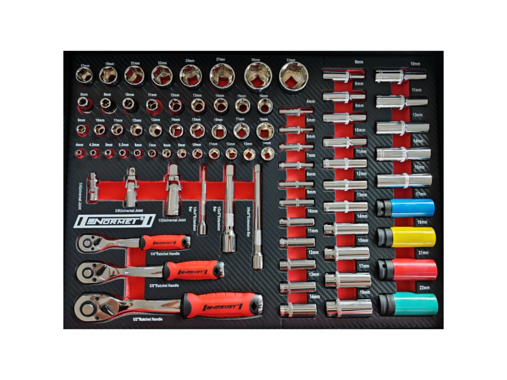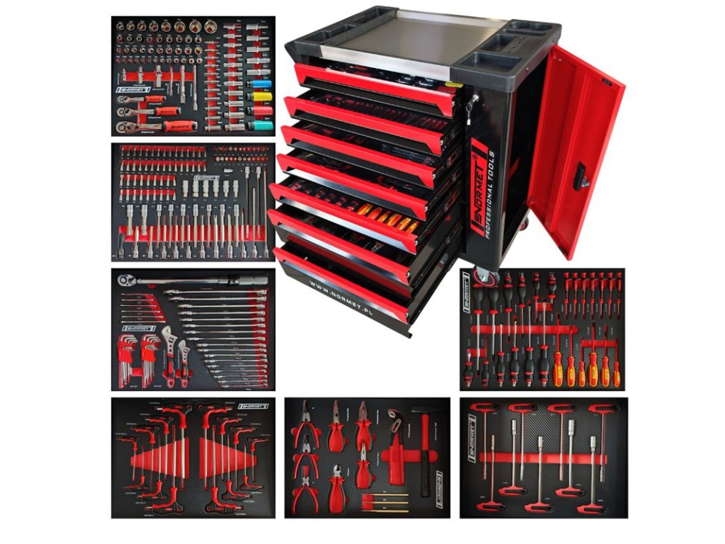 Vozík na náradie NORMET so 269 dielmi je kompletne vybavené riešenie pre autoservisy, dielne a technické prevádzky. Robustný dielenský vozík so 7 zásuvkami obsahuje široký sortiment gola sád, bitov, kľúčov, skrutkovačov, klieští a meracieho náradia